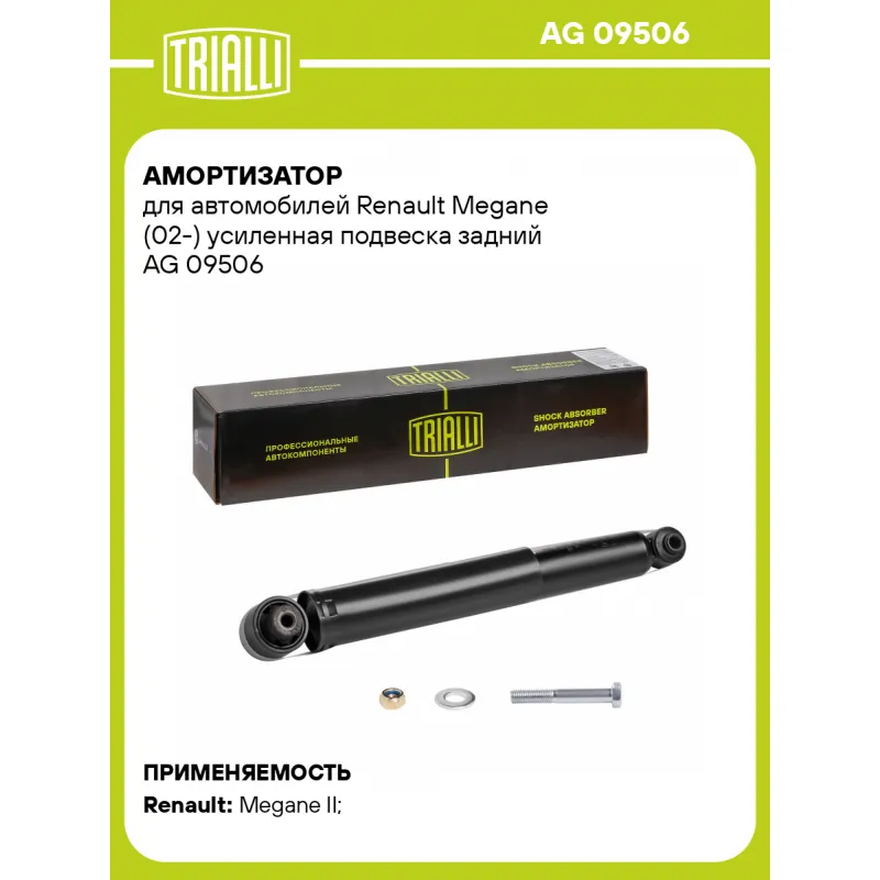 Амортизатор для автомобилей Renault Megane (02-) усиленная подвеска задний Описание: Амортизатор AG 09506 бренда TRIALLI – это устройство для гашения колебаний (демпфирования) и поглощения толчков и ударов, действующих на раму. Особенности AG 09506: - Вид – Масляный с газовым подпором низкого давления; - Тип – Двухтрубный, гидравлический; Для крепления к деталям кузова или подвески используются крепления: верхнее Проушина/сайлентблок ; и нижнее Проушина/сайлентблок. Совместим с: RENAULT MEGANE.Подбор по VIN-номеру вашего автомобиля - через кнопку 'Задать вопрос'. Специалист проверит применяемость и ответит вам. Преимущества: - Инновационная технология производства; - Контроль качества каждой позиции по чертежам и с помощью 3D модели; - Сальник NOK; - Высокоэффективная система проектирования; - Гарантия до двух лет или 60 000 км пробега; Амортизаторы автомобильные существенно влияют на комфорт вождения, сокращая вибрации от неровностей дороги, что делает поездку более плавной и приятной. Регулярное и своевременное обслуживание амортизаторов помогут продлить их срок службы и обеспечить надёжную работу. Характеристики: Артикул: AG 09506 OEM номера: 8200069471, 8200122947, 8200312454, 8200869345 Товарная линейка: BLACK Количество на автомобиль: 2 Вид амортизатора: Масляный с газовым подпором низкого давления Тип верхнего крепления: Проушина/сайлентблок Тип нижнего крепления: Проушина/сайлентблок Диаметр корпуса, мм: 41 Диаметр штока, мм: 12,5 Ход штока, мм: 174 Тип амортизатора: Двухтрубный, гидравлический Ось (сторона установки): Сзади, слева/справа Дополнительная информация: Дла а/м со усиленной ходовой Присоединительная длина 2, мм: 500 Присоединительная длина 1, мм: 326 Сопутствующий товар: Амортизаторы: AG 09054; AG 09505 Гарантийный срок: 2 года/60 000 км Подходит для авто: Renault Megane II (02-), Megane II (02-) Для проверки применяемости отправьте VIN автомобиля через вкладку "Есть вопросы о товаре?" Комплектация: Амортизатор задний - 1 шт Шарнир резинометаллический - 2 шт Гарантия: от 1 года.