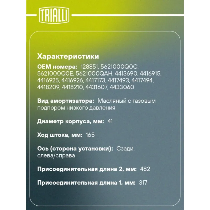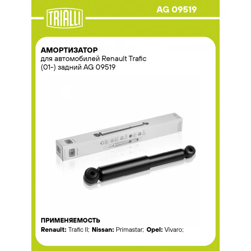 Амортизатор для автомобилей Renault Trafic (01-) задний Описание: Амортизатор AG 09519 бренда TRIALLI – это устройство для гашения колебаний (демпфирования) и поглощения толчков и ударов, действующих на раму. Особенности AG 09519: - Вид – Масляный с газовым подпором низкого давления; - Тип – Двухтрубный, гидравлический; Для крепления к деталям кузова или подвески используются крепления: верхнее Проушина/сайлентблок ; и нижнее Проушина/сайлентблок. Совместим с: NISSAN PRIMASTAR, OPEL VIVARO, RENAULT TRAFIC.Подбор по VIN-номеру вашего автомобиля - через кнопку 'Задать вопрос'. Специалист проверит применяемость и ответит вам. Преимущества: - Инновационная технология производства; - Контроль качества каждой позиции по чертежам и с помощью 3D модели; - Сальник NOK; - Высокоэффективная система проектирования; - Гарантия до двух лет или 60 000 км пробега; Амортизаторы автомобильные существенно влияют на комфорт вождения, сокращая вибрации от неровностей дороги, что делает поездку более плавной и приятной. Регулярное и своевременное обслуживание амортизаторов помогут продлить их срок службы и обеспечить надёжную работу. Характеристики: Артикул: AG 09519 OEM номера: 128851, 5621000Q0C, 5621000Q0E, 5621000QAH, 4413690, 4416915, 4416925, 4416926, 4417173, 4417493, 4417494, 4418209, 4418210, 4431607, 4433060, 4433061, 4433062, 91165837, 91169486, 93198028, 93198029, 93852203, 93858271, 93858272, 93858428, 93858429, 93858430, 93858554, 93858555, 93860706, 93860707, 4408274, 4416914, 7701066495, 7701066496, 7701066497, 8200046851, 8200206026, 8200220121, 8200529680, 8200529682, 8200587187, 8200587188, 8200587191, 8200600877, 8200600878, 8200726567, 8200726572, 93198027 Товарная линейка: BLACK Количество на автомобиль: 2 Вид амортизатора: Масляный с газовым подпором низкого давления Тип верхнего крепления: Проушина/сайлентблок Тип нижнего крепления: Проушина/сайлентблок Диаметр корпуса, мм: 41 Диаметр штока, мм: 12,5 Ход штока, мм: 165 Тип амортизатора: Двухтрубный, гидравлический Ось (сторона установки): Сзади, слева/справа Дополнительная информация: Упаковка изделия может отличаться от представленной на фото Присоединительная длина 2, мм: 482 Присоединительная длина 1, мм: 317 Сопутствующий товар: Амортизаторы: AG 09064 Гарантийный срок: 2 года/60 000 км Подходит для авто: Renault Trafic II (01-), Trafic II (01-) Nissan Primastar (01-), Primastar (01-) Opel Vivaro (01-), Vivaro (01-) Для проверки применяемости отправьте VIN автомобиля через вкладку "Есть вопросы о товаре?" Комплектация: Амортизатор задний - 1 шт Шарнир резинометаллический - 2 шт Гарантия: от 1 года.