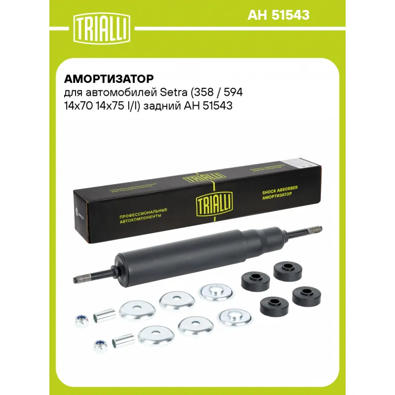 Амортизатор для автомобилей Setra (358 / 594 14x70 14x75 I/I) задний Описание: Амортизатор AH 51543 бренда TRIALLI – это устройство для гашения колебаний (демпфирования) и поглощения толчков и ударов, действующих на раму. Особенности AH 51543: - Вид – Масляный; - Тип – Двухтрубный, гидравлический; Для крепления к деталям кузова или подвески используются крепления: верхнее Шток M14x1,5; и нижнее Корпус/палец. Совместим с: автомобилей Setra (358 / 594 14x70 14x75 I/I)Подбор по VIN-номеру вашего автомобиля - через кнопку 'Задать вопрос'. Специалист проверит применяемость и ответит вам. Преимущества: - Инновационная технология производства; - Контроль качества каждой позиции по чертежам и с помощью 3D модели; - Сальник NOK; - Высокоэффективная система проектирования; - Гарантия до двух лет или 60 000 км пробега; Амортизаторы автомобильные существенно влияют на комфорт вождения, сокращая вибрации от неровностей дороги, что делает поездку более плавной и приятной. Регулярное и своевременное обслуживание амортизаторов помогут продлить их срок службы и обеспечить надёжную работу. Характеристики: Артикул: AH 51543 OEM номера: 8.231.348.000.0, 8.231.323.000D Товарная линейка: BLACK Количество на автомобиль: 2 Вид амортизатора: Масляный Тип верхнего крепления: Шток Тип нижнего крепления: Корпус/палец Диаметр корпуса, мм: 54 Диаметр штока, мм: 15 Ход штока, мм: 236 Размер резьбы штока: M14x1,5 Тип амортизатора: Двухтрубный, гидравлический Ось (сторона установки): Сзади, слева/справа Дополнительная информация: Упаковка изделия может отличаться от представленной на фото Присоединительная длина 2, мм: 594 Присоединительная длина 1, мм: 358 Гарантийный срок: 2 года/60 000 км Комплектация: Амортизатор задний - 1 шт Гайка крепежная - 2 шт Втулка распорная - 2 шт Шайба - 6 шт Подушка резиновая - 4 шт Гарантия: от 1 года.