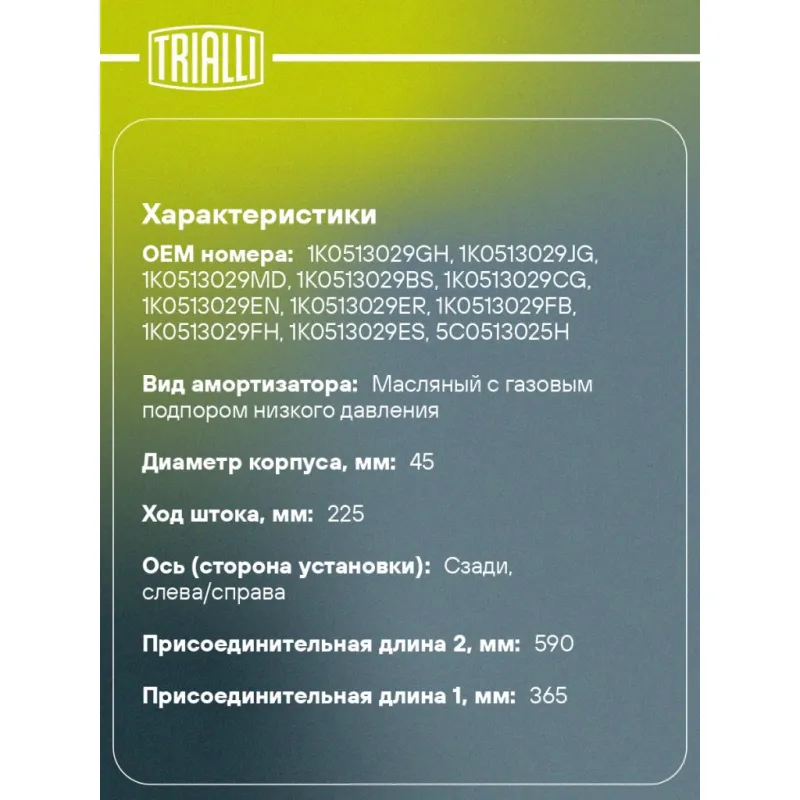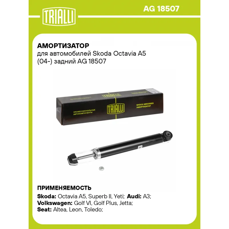 Амортизатор для автомобилей Skoda Octavia A5 (04-) задний Описание: Амортизатор AG 18507 бренда TRIALLI – это устройство для гашения колебаний (демпфирования) и поглощения толчков и ударов, действующих на раму. Особенности AG 18507: - Вид – Масляный с газовым подпором низкого давления ; - Тип – Двухтрубный, гидравлический; Для крепления к деталям кузова или подвески используются крепления: верхнее Шток M10x1.0; и нижнее Проушина/сайлентблок. Совместим с: AUDI A3, SEAT ALHAMBRA, ALTEA, LEON, TOLEDO, SKODA SUPERB, YETI, OCTAVIA, VW SHARAN, JETTA, SCIROCCO, PASSAT, GOLF, TOURAN, CC, GOLF PLUS.Подбор по VIN-номеру вашего автомобиля - через кнопку 'Задать вопрос'. Специалист проверит применяемость и ответит вам. Преимущества: - Инновационная технология производства; - Контроль качества каждой позиции по чертежам и с помощью 3D модели; - Сальник NOK; - Высокоэффективная система проектирования; - Гарантия до двух лет или 60 000 км пробега; Амортизаторы автомобильные существенно влияют на комфорт вождения, сокращая вибрации от неровностей дороги, что делает поездку более плавной и приятной. Регулярное и своевременное обслуживание амортизаторов помогут продлить их срок службы и обеспечить надёжную работу. Характеристики: Артикул: AG 18507 OEM номера: 1K0513029GH, 1K0513029JG, 1K0513029MD, 1K0513029BS, 1K0513029CG, 1K0513029EN, 1K0513029ER, 1K0513029FB, 1K0513029FH, 1K0513029ES, 5C0513025H, 5C0513029C, 5C0513029D, 5C0513029E, 7N0513049B, 1K0513029FA, 1K0513029CA, 561513049D, 5C0513025A, 5C0513025D, 5C0513025J, 5C0513029, 5C0513029B, 3C0513049CH, 3C0513049CJ, 3C0513049CP, 561513049, 561513049B, 561513049C, 3C0513049BF, 3C0513049BG, 3C0513049BJ, 3C0513049BQ, 3C0513049BS, 3C0513049CE, 3AA513049B, 3AA513049C, 3C0513049AP, 3C0513049AQ, 3C0513049BD, 3C0513049BE, 1T0513029D, 1T0513029E, 1T0513029M, 1T0513029N, 1T0513029P, 1T0513029S, 1K0513029ME, 1K0513029MF, 1K0513029MG, 1K0513029MK, 1K0513029ML, 1K0513031HQ, 1K0513029HT, 1K0513029JD, 1K0513029JF, 1K0513029JH, 1K0513029JJ, 1K0513029MB, 1K0513029GP, 1K0513029GT, 1K0513029HC, 1K0513029HE, 1K0513029HL, 1K0513029HQ, 1K0513029FL, 1K0513029FM, 1K0513029GC, 1K0513029GD, 1K0513029GE, 1K0513029GJ, 1K0513029DT, 1K0513029ED, 1K0513029FC, 1K0513029FD, 1K0513029FJ, 1K0513029FK, 1K0513029CJ, 1K0513029CK, 1K0513029CM, 1K0513029CQ, 1K0513029CR, 1K0513029DD, 1K0513029GB, 1K0513029MC, 1K0513029MQ, 3C0513049AR, 3C0513049BR, 1K0513029CE, 1K0513029HA, 1K0513029HF, 1K0513029HR, 1K0513029HS, 1K0513029JA, 1K0513029EP Товарная линейка: BLACK Количество на автомобиль: 2 Вид амортизатора: Масляный с газовым подпором низкого давления Тип верхнего крепления: Шток Тип нижнего крепления: Проушина/сайлентблок Диаметр корпуса, мм: 45 Диаметр штока, мм: 12,5 Ход штока, мм: 225 Размер резьбы штока: M10x1.0 Тип амортизатора: Двухтрубный, гидравлический Ось (сторона установки): Сзади, слева/справа Дополнительная информация: Для а/м со стандратной подвеской Присоединительная длина 2, мм: 590 Сопутствующий товар: Опоры передних стоек: SA 1852; SA 1863 Присоединительная длина 1, мм: 365 Сопутствующий товар: Амортизаторы: AG 18050, AG 18064, AG 18518 Гарантийный срок: 2 года/60 000 км Подходит для авто: Skoda Octavia A5 (04-), Superb II (08-), Yeti (09-), Octavia A5 (04-), Yeti (09-) Audi A3 (03-), A3 (03-) Volkswagen Golf VI (08-), Golf Plus (05-), Golf Plus (09-), Jetta (05-), Jetta (11-), Passat B6 (05-), Passat B6 (05-), Passat CC (08-), Passat CC (08-), Passat CC (08-), Scirocco (08-), Sharan (10-), Touran (03-), Golf V (03-), Golf VI (08-), Jetta (05-), Passat B6 (05-), Passat B7 (10-), Touran (03-) Seat Altea (04-), Leon (05-), Leon (05-), Toledo (04-) Для проверки применяемости отправьте VIN автомобиля через вкладку "Есть вопросы о товаре?" Комплектация: Амортизатор задний - 1 шт Гайка крепежная - 1 шт Гарантия: от 1 года.
