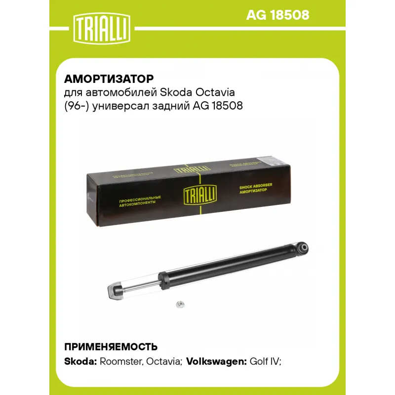 Амортизатор для автомобилей Skoda Octavia (96-) универсал задний Описание: Амортизатор AG 18508 бренда TRIALLI – это устройство для гашения колебаний (демпфирования) и поглощения толчков и ударов, действующих на раму. Особенности AG 18508: - Вид – Масляный с газовым подпором низкого давления ; - Тип – Двухтрубный, гидравлический; Для крепления к деталям кузова или подвески используются крепления: верхнее Шток M10x1.0; и нижнее Проушина/сайлентблок. Совместим с: SKODA ROOMSTER, OCTAVIA, VW BORA, GOLF.Подбор по VIN-номеру вашего автомобиля - через кнопку 'Задать вопрос'. Специалист проверит применяемость и ответит вам. Преимущества: - Инновационная технология производства; - Контроль качества каждой позиции по чертежам и с помощью 3D модели; - Сальник NOK; - Высокоэффективная система проектирования; - Гарантия до двух лет или 60 000 км пробега; Амортизаторы автомобильные существенно влияют на комфорт вождения, сокращая вибрации от неровностей дороги, что делает поездку более плавной и приятной. Регулярное и своевременное обслуживание амортизаторов помогут продлить их срок службы и обеспечить надёжную работу. Характеристики: Артикул: AG 18508 OEM номера: 1J0513025AD, 1J0513025BK, 1J0513025BN, 1J0513025BQ, 1J0513025CB, 1J0513025, 1J0513025AG, 1J0513025B, 1J0513025DJ, 1J0513031AD, 1J9513025A, 1J9513025E, 1J9513025F, 1J0512011BR, 1J9513025C Товарная линейка: BLACK Количество на автомобиль: 2 Вид амортизатора: Масляный с газовым подпором низкого давления Тип верхнего крепления: Шток Тип нижнего крепления: Проушина/сайлентблок Диаметр корпуса, мм: 38 Диаметр штока, мм: 12,5 Ход штока, мм: 220 Размер резьбы штока: M10x1.0 Тип амортизатора: Двухтрубный, гидравлический Ось (сторона установки): Сзади, слева/справа Дополнительная информация: Для а/м с кузовом универсал Присоединительная длина 2, мм: 665 Присоединительная длина 1, мм: 445 Сопутствующий товар: Ремонтные комплекты амортизаторов: BCS 1848 Сопутствующий товар: Амортизаторы: AG 18051 Гарантийный срок: 2 года/60 000 км Подходит для авто: Skoda Roomster (06-), Octavia (96-), Roomster (06-) Volkswagen Golf IV (97-), Golf IV (97-) Для проверки применяемости отправьте VIN автомобиля через вкладку "Есть вопросы о товаре?" Комплектация: Амортизатор задний - 1 шт Гайка крепежная - 1 шт Шарнир резинометаллический - 1 шт Гарантия: от 1 года.
