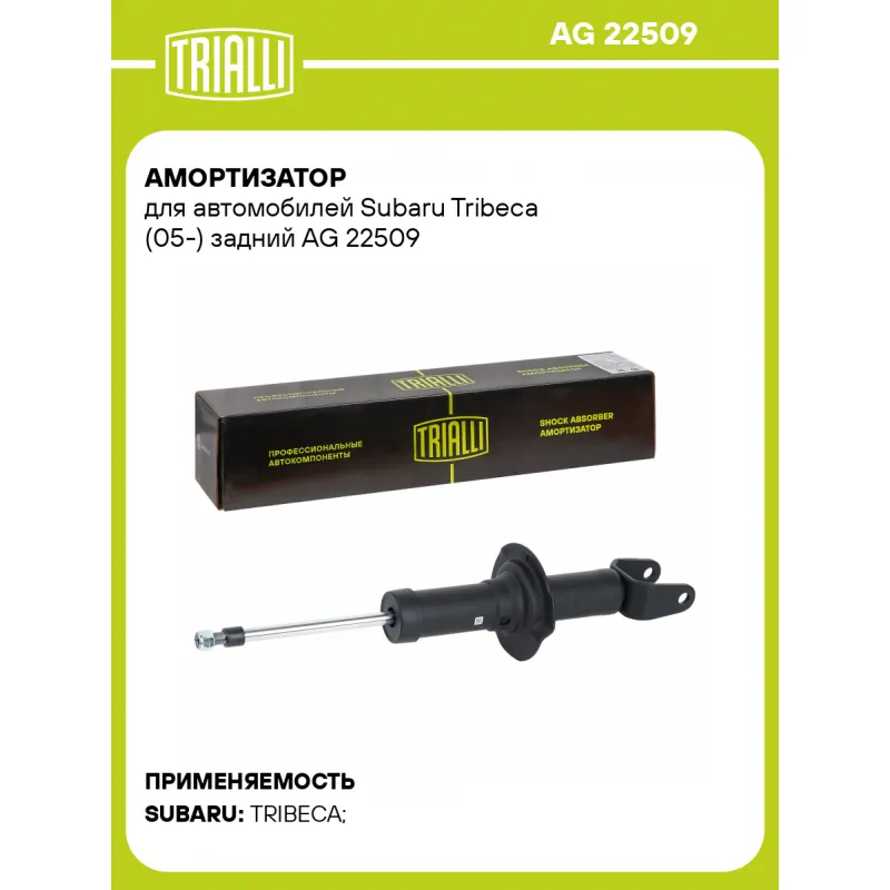 Амортизатор для автомобилей Subaru Tribeca (05-) задний Описание: Амортизатор AG 22509 бренда TRIALLI – это устройство для гашения колебаний (демпфирования) и поглощения толчков и ударов, действующих на раму. Особенности AG 22509: - Вид – Масляный с газовым подпором низкого давления; - Тип – Двухтрубный, гидравлический; Для крепления к деталям кузова или подвески используются крепления: верхнее Шток M12x1,25; и нижнее Кронштейн. Совместим с: SUBARU TRIBECA.Подбор по VIN-номеру вашего автомобиля - через кнопку 'Задать вопрос'. Специалист проверит применяемость и ответит вам. Преимущества: - Инновационная технология производства; - Контроль качества каждой позиции по чертежам и с помощью 3D модели; - Сальник NOK; - Высокоэффективная система проектирования; - Гарантия до двух лет или 60 000 км пробега; Амортизаторы автомобильные существенно влияют на комфорт вождения, сокращая вибрации от неровностей дороги, что делает поездку более плавной и приятной. Регулярное и своевременное обслуживание амортизаторов помогут продлить их срок службы и обеспечить надёжную работу. Характеристики: Артикул: AG 22509 OEM номера: 20365XA01A, 20370AA000, 20379XA00A Товарная линейка: BLACK Количество на автомобиль: 2 Вид амортизатора: Масляный с газовым подпором низкого давления Тип верхнего крепления: Шток Тип нижнего крепления: Кронштейн Диаметр корпуса, мм: 45 Диаметр штока, мм: 12.5 Ход штока, мм: 146 Размер резьбы штока: M12x1,25 Тип амортизатора: Двухтрубный, гидравлический Ось (сторона установки): Сзади, слева/справа Дополнительная информация: Упаковка изделия может отличаться от представленной на фото Присоединительная длина 2, мм: 465 Присоединительная длина 1, мм: 319 Сопутствующий товар: Амортизаторы: AG 22166, AG 22367 Гарантийный срок: 2 года/60 000 км Комплектация: Амортизатор задний - 1 шт Гайка крепежная - 1 шт Гарантия: от 1 года.