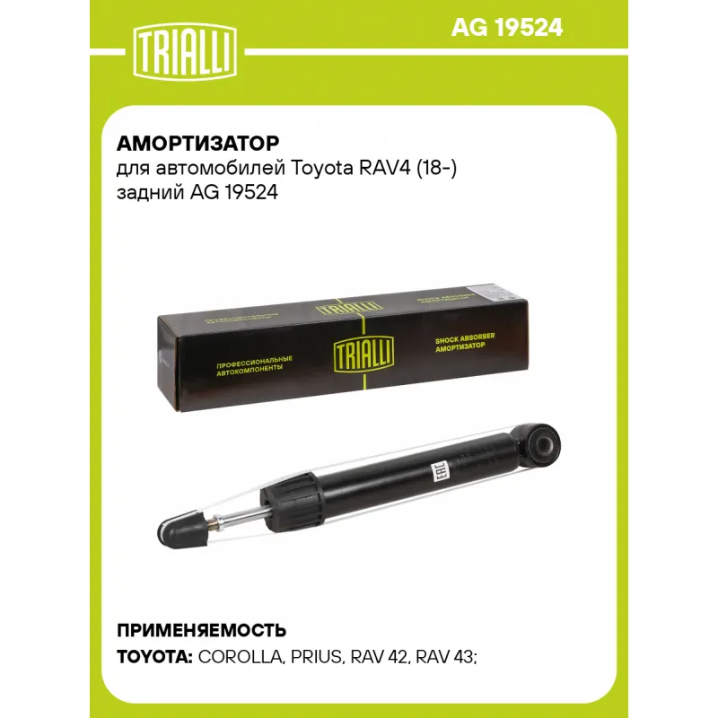 Амортизатор для автомобилей Toyota RAV4 (18-) задний Описание: Амортизатор AG 19524 бренда TRIALLI – это устройство для гашения колебаний (демпфирования) и поглощения толчков и ударов, действующих на раму. Особенности AG 19524: - Вид – Масляный с газовым подпором низкого давления; - Тип – Двухтрубный, гидравлический; Для крепления к деталям кузова или подвески используются крепления: верхнее Шток M12x1.25; и нижнее Проушина/сайлентблок. Совместим с: TOYOTA COROLLA, PRIUS, RAV 4.Подбор по VIN-номеру вашего автомобиля - через кнопку 'Задать вопрос'. Специалист проверит применяемость и ответит вам. Преимущества: - Инновационная технология производства; - Контроль качества каждой позиции по чертежам и с помощью 3D модели; - Сальник NOK; - Высокоэффективная система проектирования; - Гарантия до двух лет или 60 000 км пробега; Амортизаторы автомобильные существенно влияют на комфорт вождения, сокращая вибрации от неровностей дороги, что делает поездку более плавной и приятной. Регулярное и своевременное обслуживание амортизаторов помогут продлить их срок службы и обеспечить надёжную работу. Характеристики: Артикул: AG 19524 OEM номера: 48530-80895, 48530-42190, 48530-80A42, 48530-80A45, 48530-42220, 48530-42250 Товарная линейка: BLACK Количество на автомобиль: 2 Вид амортизатора: Масляный с газовым подпором низкого давления Тип верхнего крепления: Шток Тип нижнего крепления: Проушина/сайлентблок Диаметр корпуса, мм: 45 Диаметр штока, мм: 12.5 Ход штока, мм: 164 Размер резьбы штока: M12x1.25 Тип амортизатора: Двухтрубный, гидравлический Ось (сторона установки): Сзади, слева/справа Дополнительная информация: Упаковка изделия может отличаться от представленной на фото Присоединительная длина 2, мм: 504 Присоединительная длина 1, мм: 340 Гарантийный срок: 2 года/60 000 км Комплектация: Гайка крепежная - 1 шт Амортизатор задний - 1 шт Гарантия: от 1 года.
