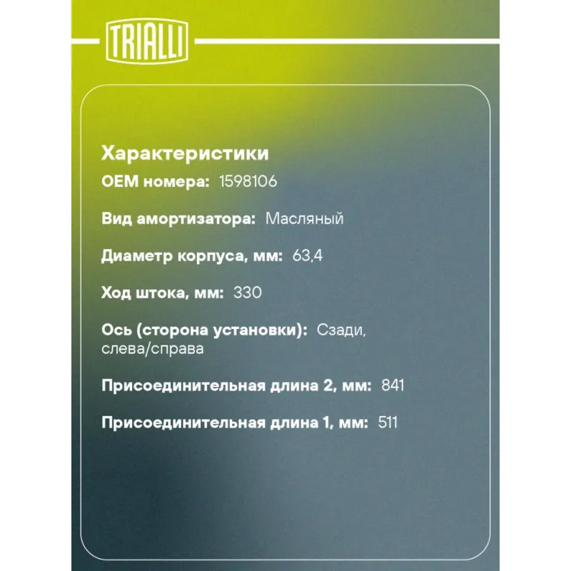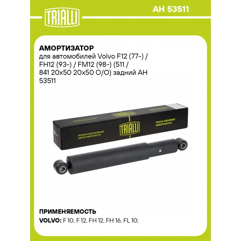 Амортизатор для автомобилей Volvo F12 (77-) / FH12 (93-) / FM12 (98-) (511 / 841 20x50 20x50 O/O) задний Описание: Амортизатор AH 53511 бренда TRIALLI – это устройство для гашения колебаний (демпфирования) и поглощения толчков и ударов, действующих на раму. Особенности AH 53511: - Вид – Масляный; - Тип – Двухтрубный, гидравлический; Для крепления к деталям кузова или подвески используются крепления: верхнее Проушина/сайлентблок ; и нижнее Проушина/сайлентблок. Совместим с: VOLVO F, FH, FL, FM.Подбор по VIN-номеру вашего автомобиля - через кнопку 'Задать вопрос'. Специалист проверит применяемость и ответит вам. Преимущества: - Инновационная технология производства; - Контроль качества каждой позиции по чертежам и с помощью 3D модели; - Сальник NOK; - Высокоэффективная система проектирования; - Гарантия до двух лет или 60 000 км пробега; Амортизаторы автомобильные существенно влияют на комфорт вождения, сокращая вибрации от неровностей дороги, что делает поездку более плавной и приятной. Регулярное и своевременное обслуживание амортизаторов помогут продлить их срок службы и обеспечить надёжную работу. Характеристики: Артикул: AH 53511 OEM номера: 1598106 Товарная линейка: BLACK Количество на автомобиль: 2 Вид амортизатора: Масляный Тип верхнего крепления: Проушина/сайлентблок Тип нижнего крепления: Проушина/сайлентблок Диаметр корпуса, мм: 63.4 Диаметр штока, мм: 20 Ход штока, мм: 330 Тип амортизатора: Двухтрубный, гидравлический Ось (сторона установки): Сзади, слева/справа Дополнительная информация: Упаковка изделия может отличаться от представленной на фото Присоединительная длина 2, мм: 841 Присоединительная длина 1, мм: 511 Гарантийный срок: 2 года/60 000 км Комплектация: Амортизатор задний - 1 шт Гарантия: от 1 года.