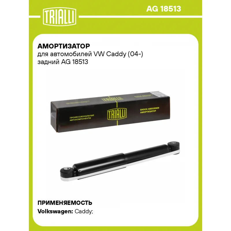 Амортизатор для автомобилей VW Caddy (04-) задний Описание: Амортизатор AG 18513 бренда TRIALLI – это устройство для гашения колебаний (демпфирования) и поглощения толчков и ударов, действующих на раму. Особенности AG 18513: - Вид – Масляный с газовым подпором низкого давления; - Тип – Двухтрубный, гидравлический; Для крепления к деталям кузова или подвески используются крепления: верхнее Проушина/сайлентблок ; и нижнее Проушина/сайлентблок. Совместим с: VW CADDY.Подбор по VIN-номеру вашего автомобиля - через кнопку 'Задать вопрос'. Специалист проверит применяемость и ответит вам. Преимущества: - Инновационная технология производства; - Контроль качества каждой позиции по чертежам и с помощью 3D модели; - Сальник NOK; - Высокоэффективная система проектирования; - Гарантия до двух лет или 60 000 км пробега; Амортизаторы автомобильные существенно влияют на комфорт вождения, сокращая вибрации от неровностей дороги, что делает поездку более плавной и приятной. Регулярное и своевременное обслуживание амортизаторов помогут продлить их срок службы и обеспечить надёжную работу. Характеристики: Артикул: AG 18513 OEM номера: 2K03513029F, 2K0513029B, 2K0513029F, 2K0513029G, 2K0513029H, 2K0513029M, 2K0513029N Товарная линейка: BLACK Количество на автомобиль: 2 Вид амортизатора: Масляный с газовым подпором низкого давления Тип верхнего крепления: Проушина/сайлентблок Тип нижнего крепления: Проушина/сайлентблок Диаметр корпуса, мм: 45 Диаметр штока, мм: 12,5 Ход штока, мм: 169 Тип амортизатора: Двухтрубный, гидравлический Ось (сторона установки): Сзади, слева/справа Дополнительная информация: Упаковка изделия может отличаться от представленной на фото Присоединительная длина 2, мм: 477 Сопутствующий товар: Опоры передних стоек: SA 1852; SA 1863 Присоединительная длина 1, мм: 306 Сопутствующий товар: Амортизаторы: AG 18050; AG 18064 Гарантийный срок: 2 года/60 000 км Подходит для авто: Volkswagen Caddy (04-), Caddy (04-) Для проверки применяемости отправьте VIN автомобиля через вкладку "Есть вопросы о товаре?" Комплектация: Амортизатор задний - 1 шт Шарнир резинометаллический - 2 шт Гарантия: от 1 года.