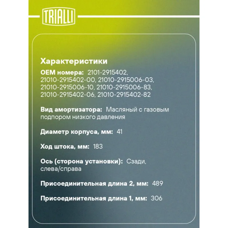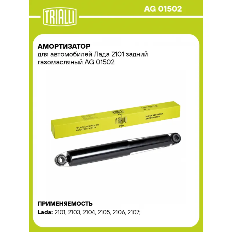 Амортизатор для автомобилей Лада 2101 задний газомасляный Описание: Амортизатор AG 01502 бренда TRIALLI – это устройство для гашения колебаний (демпфирования) и поглощения толчков и ударов, действующих на раму. Особенности AG 01502: - Вид – Масляный с газовым подпором низкого давления; - Тип – Двухтрубный, гидравлический; Для крепления к деталям кузова или подвески используются крепления: верхнее Проушина/втулка ; и нижнее Проушина/втулка. Совместим с: LADA ВАЗ 2101-2107.Подбор по VIN-номеру вашего автомобиля - через кнопку 'Задать вопрос'. Специалист проверит применяемость и ответит вам. Преимущества: - Инновационная технология производства; - Контроль качества каждой позиции по чертежам и с помощью 3D модели; - Сальник NOK; - Высокоэффективная система проектирования; - Гарантия до двух лет или 60 000 км пробега; Амортизаторы автомобильные существенно влияют на комфорт вождения, сокращая вибрации от неровностей дороги, что делает поездку более плавной и приятной. Регулярное и своевременное обслуживание амортизаторов помогут продлить их срок службы и обеспечить надёжную работу. Характеристики: Артикул: AG 01502 OEM номера: 2101-2915402, 21010-2915402-00, 21010-2915006-03, 21010-2915006-10, 21010-2915006-83, 21010-2915402-06, 21010-2915402-82 Товарная линейка: PRO Количество на автомобиль: 2 Вид амортизатора: Масляный с газовым подпором низкого давления Тип верхнего крепления: Проушина/втулка Тип нижнего крепления: Проушина/втулка Диаметр корпуса, мм: 41 Диаметр штока, мм: 12,5 Ход штока, мм: 183 Тип амортизатора: Двухтрубный, гидравлический Ось (сторона установки): Сзади, слева/справа Дополнительная информация: Упаковка изделия может отличаться от представленной на фото Присоединительная длина 2, мм: 489 Присоединительная длина 1, мм: 306 Сопутствующий товар: Амортизаторы: AH 01502,AH 01001, AG 01001 Гарантийный срок: 2 года/60 000 км Подходит для авто: ВАЗ 2101, 2101, 2103, 2103, 2104, 2105, 2105, 2106, 2106, 2107, 2104, 2105, 2107 Для проверки применяемости отправьте VIN автомобиля через вкладку "Есть вопросы о товаре?" Комплектация: Амортизатор задний - 1 шт Втулка резиновая - 2 шт Гарантия: от 1 года.