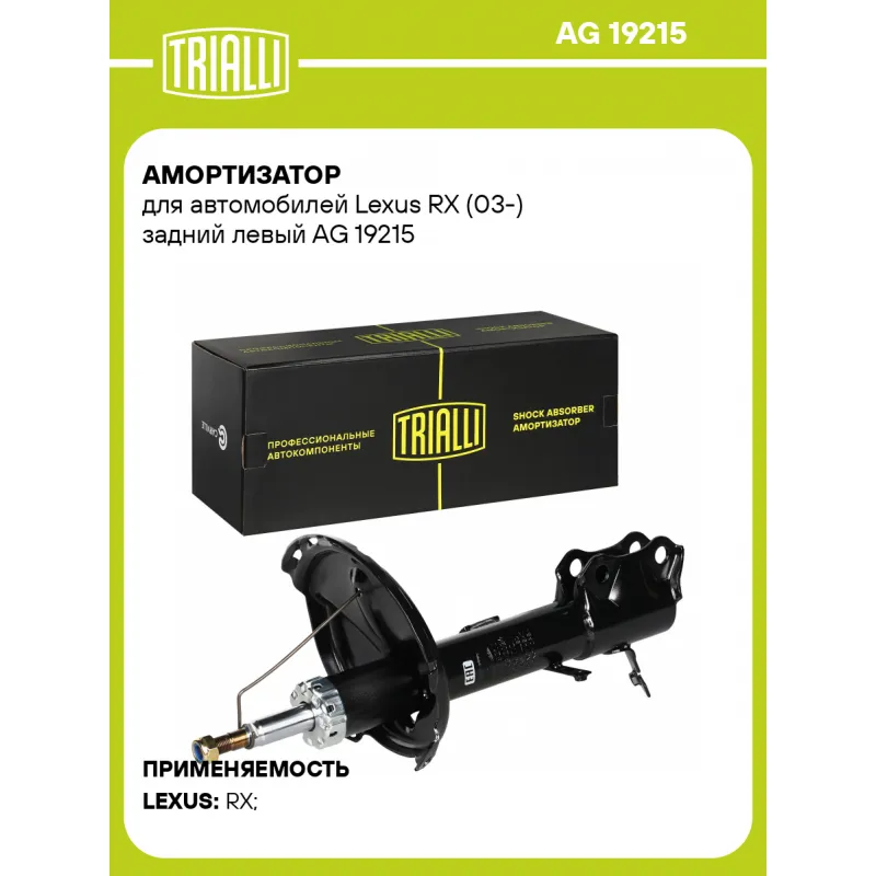 Амортизатор для автомобилей Lexus RX (03-) задний левый Описание: Амортизатор AG 19215 бренда TRIALLI – это устройство для гашения колебаний (демпфирования) и поглощения толчков и ударов, действующих на раму. Особенности AG 19215: - Вид – Масляный с газовым подпором низкого давления; - Тип – Двухтрубный, гидравлический; Для крепления к деталям кузова или подвески используются крепления: верхнее Шток M14x1.5; и нижнее Скоба. Совместим с: LEXUS RX.Подбор по VIN-номеру вашего автомобиля - через кнопку 'Задать вопрос'. Специалист проверит применяемость и ответит вам. Преимущества: - Инновационная технология производства; - Контроль качества каждой позиции по чертежам и с помощью 3D модели; - Сальник NOK; - Высокоэффективная система проектирования; - Гарантия до двух лет или 60 000 км пробега; Амортизаторы автомобильные существенно влияют на комфорт вождения, сокращая вибрации от неровностей дороги, что делает поездку более плавной и приятной. Регулярное и своевременное обслуживание амортизаторов помогут продлить их срок службы и обеспечить надёжную работу. Характеристики: Артикул: AG 19215 OEM номера: 48540-48160, 48540-48170, 48540-49205, 48540-49215, 48540-48230, 48540-49295, 48540-48180, 48540-49225 Товарная линейка: BLACK Парный товар: AG 19416 Количество на автомобиль: 1 Вид амортизатора: Масляный с газовым подпором низкого давления Тип верхнего крепления: Шток Тип нижнего крепления: Скоба Диаметр корпуса, мм: 51 Диаметр штока, мм: 22 Ход штока, мм: 203 Размер резьбы штока: M14x1.5 Тип амортизатора: Двухтрубный, гидравлический Ось (сторона установки): Сзади, слева Дополнительная информация: Упаковка изделия может отличаться от представленной на фото Присоединительная длина 2, мм: 580 Присоединительная длина 1, мм: 377 Сопутствующий товар: Амортизаторы: AG 19416, AG 19183, AG 19384 Гарантийный срок: 2 года/60 000 км Комплектация: Гайка крепежная - 1 шт Амортизатор задний - 1 шт Гарантия: от 1 года.