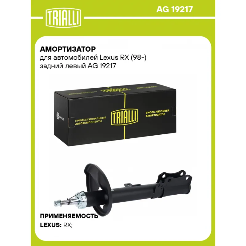 Амортизатор для автомобилей Lexus RX (98-) задний левый Описание: Амортизатор AG 19217 бренда TRIALLI – это устройство для гашения колебаний (демпфирования) и поглощения толчков и ударов, действующих на раму. Особенности AG 19217: - Вид – Масляный с газовым подпором низкого давления; - Тип – Двухтрубный, гидравлический; Для крепления к деталям кузова или подвески используются крепления: верхнее Шток M14x1,5; и нижнее Скоба. Совместим с: LEXUS RX.Подбор по VIN-номеру вашего автомобиля - через кнопку 'Задать вопрос'. Специалист проверит применяемость и ответит вам. Преимущества: - Инновационная технология производства; - Контроль качества каждой позиции по чертежам и с помощью 3D модели; - Сальник NOK; - Высокоэффективная система проектирования; - Гарантия до двух лет или 60 000 км пробега; Амортизаторы автомобильные существенно влияют на комфорт вождения, сокращая вибрации от неровностей дороги, что делает поездку более плавной и приятной. Регулярное и своевременное обслуживание амортизаторов помогут продлить их срок службы и обеспечить надёжную работу. Характеристики: Артикул: AG 19217 OEM номера: 4854048010, 4854048030, 4854048040, 4854048050, 4854049055, 4854049075, 4854049085, 4854049095 Товарная линейка: BLACK Парный товар: AG 19418 Количество на автомобиль: 1 Вид амортизатора: Масляный с газовым подпором низкого давления Тип верхнего крепления: Шток Тип нижнего крепления: Скоба Диаметр корпуса, мм: 51 Диаметр штока, мм: 22 Ход штока, мм: 202 Размер резьбы штока: M14x1,5 Тип амортизатора: Двухтрубный, гидравлический Ось (сторона установки): Сзади, слева Дополнительная информация: Упаковка изделия может отличаться от представленной на фото Присоединительная длина 2, мм: 658 Присоединительная длина 1, мм: 456 Сопутствующий товар: Амортизаторы: AG 19418, AG 19185, AG 19386 Гарантийный срок: 2 года/60 000 км Комплектация: Амортизатор задний - 1 шт Гайка крепежная - 1 шт Шайба - 1 шт Гарантия: от 1 года.