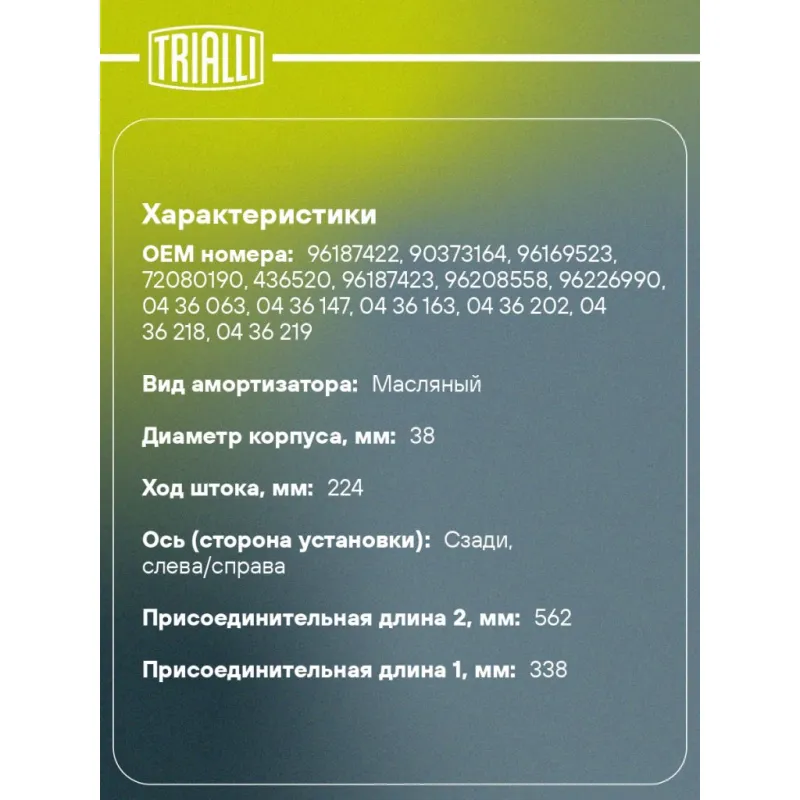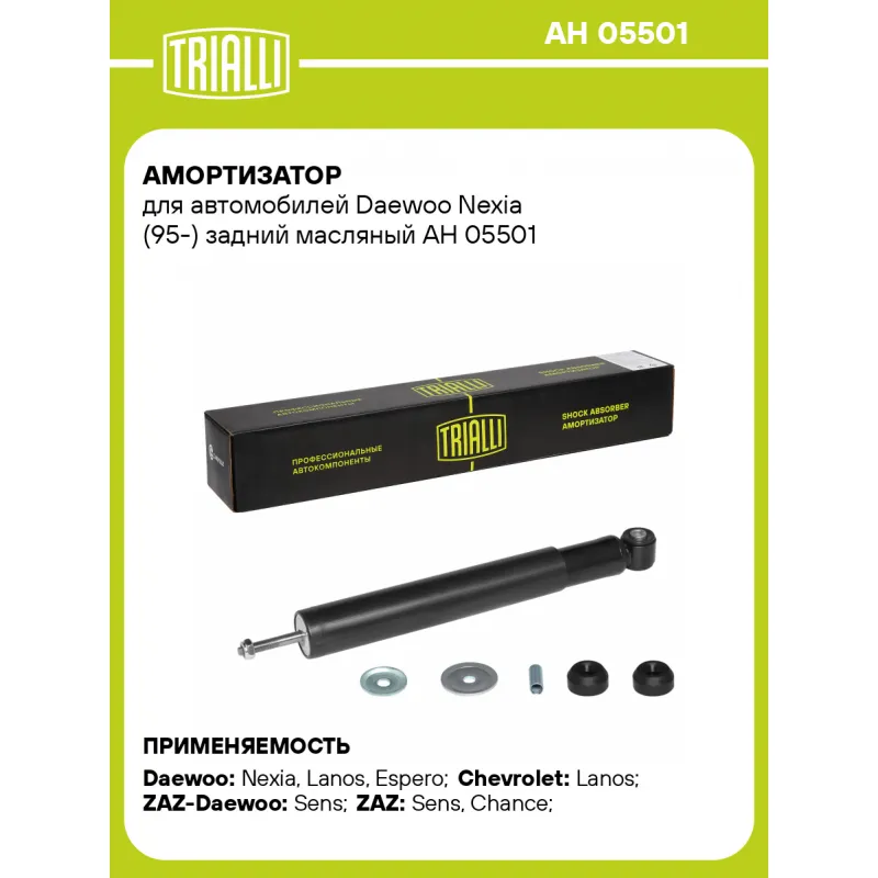 Амортизатор для автомобилей Daewoo Nexia (95-) задний масляный Описание: Амортизатор AH 05501 бренда TRIALLI – это устройство для гашения колебаний (демпфирования) и поглощения толчков и ударов, действующих на раму. Особенности AH 05501: - Вид – Масляный; - Тип – Двухтрубный, гидравлический; Для крепления к деталям кузова или подвески используются крепления: верхнее Шток M10x1.0; и нижнее Проушина/сайлентблок. Совместим с: CHEVROLET LANOS, DAEWOO NEXIA, LANOS, ESPERO, UZ-DAEWOO NEXIA, ZAZ SENS, CHANCE.Подбор по VIN-номеру вашего автомобиля - через кнопку 'Задать вопрос'. Специалист проверит применяемость и ответит вам. Преимущества: - Инновационная технология производства; - Контроль качества каждой позиции по чертежам и с помощью 3D модели; - Сальник NOK; - Высокоэффективная система проектирования; - Гарантия до двух лет или 60 000 км пробега; Амортизаторы автомобильные существенно влияют на комфорт вождения, сокращая вибрации от неровностей дороги, что делает поездку более плавной и приятной. Регулярное и своевременное обслуживание амортизаторов помогут продлить их срок службы и обеспечить надёжную работу. Характеристики: Артикул: AH 05501 OEM номера: 96187422, 90373164, 96169523, 72080190, 436520, 96187423, 96208558, 96226990, 04 36 063, 04 36 147, 04 36 163, 04 36 202, 04 36 218, 04 36 219, 04 36 224 Товарная линейка: BLACK Количество на автомобиль: 2 Вид амортизатора: Масляный Тип верхнего крепления: Шток Тип нижнего крепления: Проушина/сайлентблок Диаметр корпуса, мм: 38 Диаметр штока, мм: 12,5 Ход штока, мм: 224 Размер резьбы штока: M10x1.0 Тип амортизатора: Двухтрубный, гидравлический Ось (сторона установки): Сзади, слева/справа Дополнительная информация: Упаковка изделия может отличаться от представленной на фото Присоединительная длина 2, мм: 562 Сопутствующий товар: Опоры передних стоек: SA 0551; SA 0553; SA 0554; SA 0570; SA 0571 Присоединительная длина 1, мм: 338 Сопутствующий товар: Амортизаторы: AG 05501, AH 05091, AG 05091 Гарантийный срок: 2 года/60 000 км Подходит для авто: Daewoo Nexia (94-), Lanos (97-), Espero (90-), Espero (94-), Nexia (94-), Nexia new (08-) Chevrolet Lanos (97-) ZAZ-Daewoo Sens (02-) ЗАЗ Sens (02-), Chance (09-), Chance (09-) Для проверки применяемости отправьте VIN автомобиля через вкладку "Есть вопросы о товаре?" Комплектация: Амортизатор задний - 1 шт Подушка резиновая - 2 шт Шайба - 1 шт Втулка распорная - 1 шт Гайка крепежная - 1 шт Шарнир резинометаллический - 1 шт Кожух пылезащитный - 1 шт Гарантия: от 1 года.