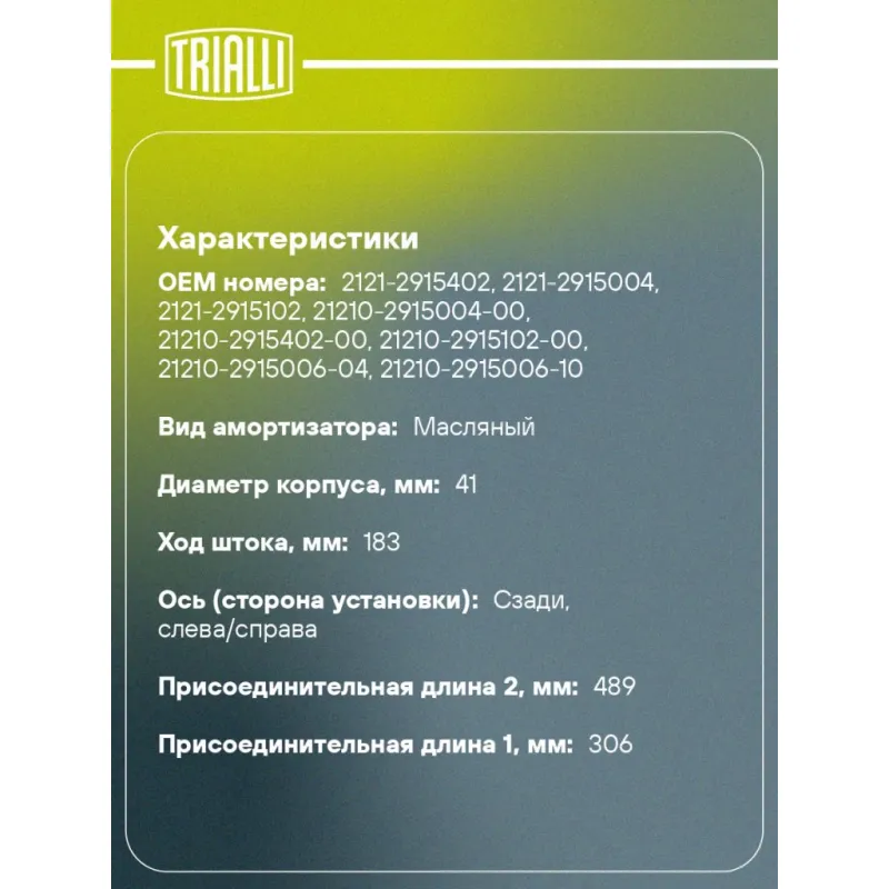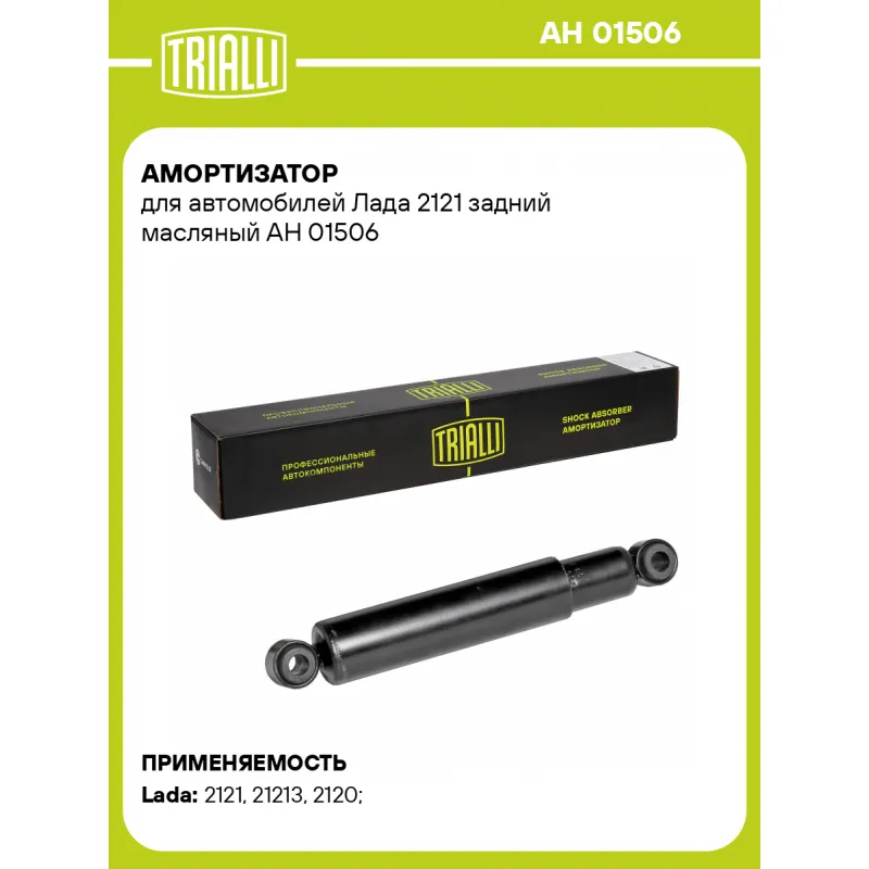 Амортизатор для автомобилей Лада 2121 задний масляный Описание: Амортизатор AH 01506 бренда TRIALLI – это устройство для гашения колебаний (демпфирования) и поглощения толчков и ударов, действующих на раму. Особенности AH 01506: - Вид – Масляный; - Тип – Двухтрубный, гидравлический; Для крепления к деталям кузова или подвески используются крепления: верхнее Проушина/втулка ; и нижнее Проушина/втулка. Совместим с: CHEVROLET NIVA, LADA Надежда, NIVA.Подбор по VIN-номеру вашего автомобиля - через кнопку 'Задать вопрос'. Специалист проверит применяемость и ответит вам. Преимущества: - Инновационная технология производства; - Контроль качества каждой позиции по чертежам и с помощью 3D модели; - Сальник NOK; - Высокоэффективная система проектирования; - Гарантия до двух лет или 60 000 км пробега; Амортизаторы автомобильные существенно влияют на комфорт вождения, сокращая вибрации от неровностей дороги, что делает поездку более плавной и приятной. Регулярное и своевременное обслуживание амортизаторов помогут продлить их срок службы и обеспечить надёжную работу. Характеристики: Артикул: AH 01506 OEM номера: 2121-2915402, 2121-2915004, 2121-2915102, 21210-2915004-00, 21210-2915402-00, 21210-2915102-00, 21210-2915006-04, 21210-2915006-10, 21210-2915402-03, 21210-2915402-82 Товарная линейка: BLACK Количество на автомобиль: 2 Вид амортизатора: Масляный Тип верхнего крепления: Проушина/втулка Тип нижнего крепления: Проушина/втулка Диаметр корпуса, мм: 41 Диаметр штока, мм: 12,5 Ход штока, мм: 183 Тип амортизатора: Двухтрубный, гидравлический Ось (сторона установки): Сзади, слева/справа Дополнительная информация: Упаковка изделия может отличаться от представленной на фото Присоединительная длина 2, мм: 489 Присоединительная длина 1, мм: 306 Сопутствующий товар: Амортизаторы: AG 01506,AH 01005, AG 01005, AG 01013, AG 01514, AH 01013, AH 01514 Гарантийный срок: 2 года/60 000 км Подходит для авто: ВАЗ 2121, 21213, 2120, 2121, 2121 Для проверки применяемости отправьте VIN автомобиля через вкладку "Есть вопросы о товаре?" Комплектация: Амортизатор задний - 1 шт Втулка резиновая - 2 шт Гарантия: от 1 года.