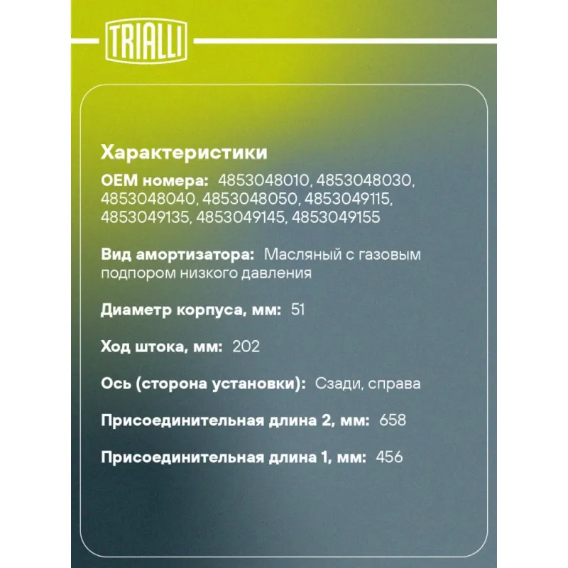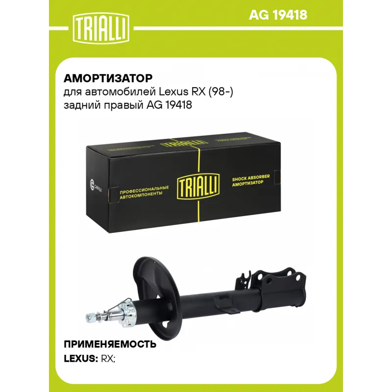 Амортизатор для автомобилей Lexus RX (98-) задний правый Описание: Амортизатор AG 19418 бренда TRIALLI – это устройство для гашения колебаний (демпфирования) и поглощения толчков и ударов, действующих на раму. Особенности AG 19418: - Вид – Масляный с газовым подпором низкого давления; - Тип – Двухтрубный, гидравлический; Для крепления к деталям кузова или подвески используются крепления: верхнее Шток M14x1,5; и нижнее Скоба. Совместим с: LEXUS RX.Подбор по VIN-номеру вашего автомобиля - через кнопку 'Задать вопрос'. Специалист проверит применяемость и ответит вам. Преимущества: - Инновационная технология производства; - Контроль качества каждой позиции по чертежам и с помощью 3D модели; - Сальник NOK; - Высокоэффективная система проектирования; - Гарантия до двух лет или 60 000 км пробега; Амортизаторы автомобильные существенно влияют на комфорт вождения, сокращая вибрации от неровностей дороги, что делает поездку более плавной и приятной. Регулярное и своевременное обслуживание амортизаторов помогут продлить их срок службы и обеспечить надёжную работу. Характеристики: Артикул: AG 19418 OEM номера: 4853048010, 4853048030, 4853048040, 4853048050, 4853049115, 4853049135, 4853049145, 4853049155 Товарная линейка: BLACK Парный товар: AG 19217 Количество на автомобиль: 1 Вид амортизатора: Масляный с газовым подпором низкого давления Тип верхнего крепления: Шток Тип нижнего крепления: Скоба Диаметр корпуса, мм: 51 Диаметр штока, мм: 22 Ход штока, мм: 202 Размер резьбы штока: M14x1,5 Тип амортизатора: Двухтрубный, гидравлический Ось (сторона установки): Сзади, справа Дополнительная информация: Упаковка изделия может отличаться от представленной на фото Присоединительная длина 2, мм: 658 Присоединительная длина 1, мм: 456 Сопутствующий товар: Амортизаторы: AG 19217, AG 19185, AG 19386 Гарантийный срок: 2 года/60 000 км Комплектация: Амортизатор задний - 1 шт Гайка крепежная - 1 шт Шайба - 1 шт Гарантия: от 1 года.