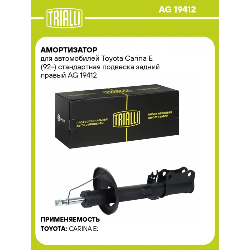 Амортизатор для автомобилей Toyota Carina E (92-) стандартная подвеска задний правый Описание: Амортизатор AG 19412 бренда TRIALLI – это устройство для гашения колебаний (демпфирования) и поглощения толчков и ударов, действующих на раму. Особенности AG 19412: - Вид – Масляный с газовым подпором низкого давления; - Тип – Двухтрубный, гидравлический; Для крепления к деталям кузова или подвески используются крепления: верхнее Шток M14x1,5; и нижнее Скоба. Совместим с: TOYOTA CARINA E.Подбор по VIN-номеру вашего автомобиля - через кнопку 'Задать вопрос'. Специалист проверит применяемость и ответит вам. Преимущества: - Инновационная технология производства; - Контроль качества каждой позиции по чертежам и с помощью 3D модели; - Сальник NOK; - Высокоэффективная система проектирования; - Гарантия до двух лет или 60 000 км пробега; Амортизаторы автомобильные существенно влияют на комфорт вождения, сокращая вибрации от неровностей дороги, что делает поездку более плавной и приятной. Регулярное и своевременное обслуживание амортизаторов помогут продлить их срок службы и обеспечить надёжную работу. Характеристики: Артикул: AG 19412 OEM номера: 4853005020, 4853020700, 4853020730, 4853020760, 4853020770, 485302B170, 485302B190, 485302B230, 485302B300, 485302B310, 485302B470 Товарная линейка: BLACK Парный товар: AG 19211 Количество на автомобиль: 1 Вид амортизатора: Масляный с газовым подпором низкого давления Тип верхнего крепления: Шток Тип нижнего крепления: Скоба Диаметр корпуса, мм: 48.5 Диаметр штока, мм: 20 Ход штока, мм: 201 Размер резьбы штока: M14x1,5 Тип амортизатора: Двухтрубный, гидравлический Ось (сторона установки): Сзади, справа Дополнительная информация: Упаковка изделия может отличаться от представленной на фото Присоединительная длина 2, мм: 606 Присоединительная длина 1, мм: 405 Сопутствующий товар: Ремонтные комплекты амортизаторов: BCS 2066 Сопутствующий товар: Амортизаторы: AG 19211 Гарантийный срок: 2 года/60 000 км Комплектация: Гайка крепежная - 1 шт Амортизатор задний - 1 шт Шайба - 1 шт Гарантия: от 1 года.