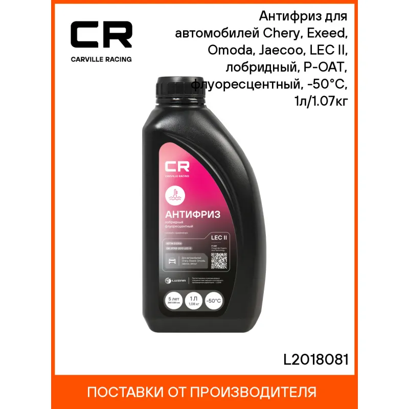 Антифриз для автомобилей Chery, Exeed, Omoda, Jaecoo, LEC II, лобридный, P-OAT, флуоресцентный, -50°С, 1л/1.07кг Описание: Охлаждающая низкозамерзающая жидкость Антифриз розовый CARVILLE RACING лобридный для легковых автомобилей. Изготовлен по Р-OAT технологии (Phosphate Organic Acid Technology) на основе этиленгликоля высшего сорта и комплекса карбоксилатных и фосфатных ингибиторов в соответствии с требованиями спецификации GB 29743-2013 LEC-II. Охлаждающая жидкость для машин не содержит силикатов, аминов, нитритов и боратов. Рекомендуется к применению в системах охлаждения автомобилей Chery, Exeed, Omoda, Jaecoo и других. Обеспечивает эффективное охлаждение двигателя, защищает от коррозии, кавитации, вспенивания и образования накипи, не агрессивна к материалам патрубков и уплотнителей. Продукт готов к применению. Эксплуатировать при температуре окружающей среды до минус 50 °С. Совместим с элементами из пластика, эластомеров или резины. Это эффективное решение для автомобильных систем охлаждения в условиях экстремальных эксплуатационных нагрузок в любое время года зимнее, осеннее, весеннее и летнее. Незаменимый автотовар обеспечивает идеальную защиту от коррозии и перегрева в самых сложных условиях эксплуатации, что делает его отличным выбором для автовладельцев. Характеристики: Артикул: L2018081 OEM номера: CHERYAFLEC1, EXEEDAFLEC1, OMODAAFLEC1 Цвет: Розовый Тип: Лобридный антифриз Состав: Этиленгликоль, пакет карбоксилатных присадок, фосфаты, вода деминерализованная, противопенные добавки, краситель. Не содержит метанол и глицерин Срок эксплуатации: В соответствии с инструкцией по эксплуатации автомобиля. Не менее 5 лет или 250 000 км Гарантийный срок хранения: 5 лет Соответствие требованиям/стандартам: ASTM D3306, GB29743 LEC-II Температура начала кристаллизации, °С: минус 50 Температура начала кипения, °C: плюс 112 Температура начала кипения при 2Атм, °С: плюс 129 Температура замерзания, °С: минус 52 Объём / Нетто / Брутто: 1л / 1,07кг / 1,14кг Применение: Продукт готов к применению. Пожаровзрывобезопасен Технология производства: Р-OAT (Phosphate Organic Acid Technology) Водородный показатель (рН): 8.7 Флуоресцентный краситель: Да Комплектация: Жидкость охлаждающая - 1 шт Гарантия: от 1 года.