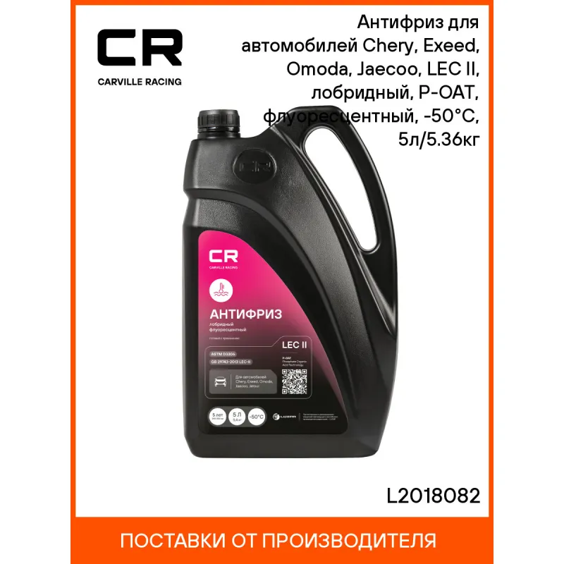 Антифриз для автомобилей Chery, Exeed, Omoda, Jaecoo, LEC II, лобридный, P-OAT, флуоресцентный, -50°С, 5л/5.36кг Описание: Охлаждающая низкозамерзающая жидкость Антифриз розовый CARVILLE RACING лобридный для легковых автомобилей. Изготовлен по Р-OAT технологии (Phosphate Organic Acid Technology) на основе этиленгликоля высшего сорта и комплекса карбоксилатных и фосфатных ингибиторов в соответствии с требованиями спецификации GB 29743-2013 LEC-II. Охлаждающая жидкость для машин не содержит силикатов, аминов, нитритов и боратов. Рекомендуется к применению в системах охлаждения автомобилей Chery, Exeed, Omoda, Jaecoo и других. Обеспечивает эффективное охлаждение двигателя, защищает от коррозии, кавитации, вспенивания и образования накипи, не агрессивна к материалам патрубков и уплотнителей. Продукт готов к применению. Эксплуатировать при температуре окружающей среды до минус 50 °С. Совместим с элементами из пластика, эластомеров или резины. Это эффективное решение для автомобильных систем охлаждения в условиях экстремальных эксплуатационных нагрузок в любое время года зимнее, осеннее, весеннее и летнее. Незаменимый автотовар обеспечивает идеальную защиту от коррозии и перегрева в самых сложных условиях эксплуатации, что делает его отличным выбором для автовладельцев. Характеристики: Артикул: L2018082 OEM номера: CHERYAFLEC5, EXEEDAFLEC5, OMODAAFLEC5 Цвет: Розовый Тип: Лобридный антифриз Состав: Этиленгликоль, пакет карбоксилатных присадок, фосфаты, вода деминерализованная, противопенные добавки, краситель. Не содержит метанол и глицерин Срок эксплуатации: В соответствии с инструкцией по эксплуатации автомобиля. Не менее 5 лет или 250 000 км Гарантийный срок хранения: 5 лет Соответствие требованиям/стандартам: ASTM D3306, GB29743 LEC-II Температура начала кристаллизации, °С: минус 50 Температура начала кипения, °C: плюс 112 Температура начала кипения при 2Атм, °С: плюс 129 Температура замерзания, °С: минус 52 Объём / Нетто / Брутто: 5л / 5,36кг / 5,61кг Применение: Продукт готов к применению. Пожаровзрывобезопасен Технология производства: Р-OAT (Phosphate Organic Acid Technology) Водородный показатель (рН): 8.7 Флуоресцентный краситель: Да Комплектация: Жидкость охлаждающая - 1 шт Гарантия: от 1 года.