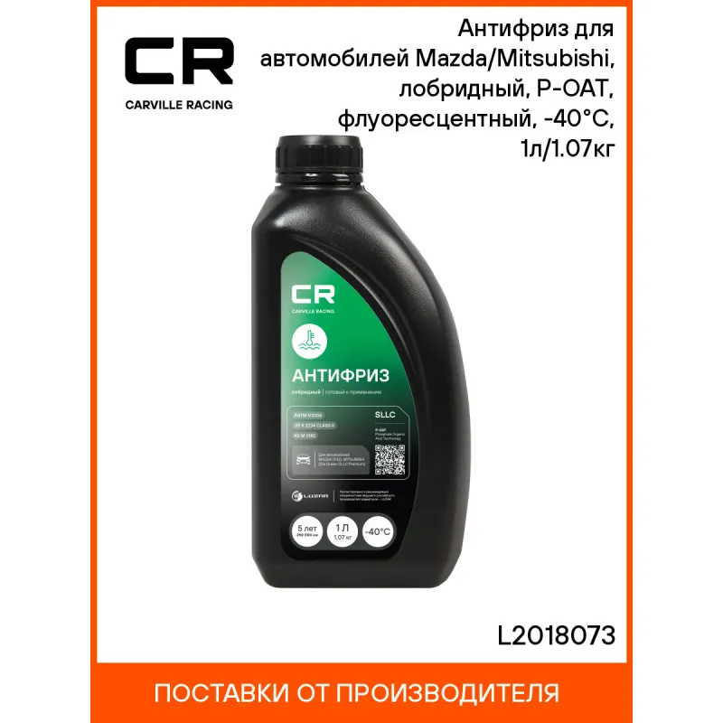 Антифриз для автомобилей Mazda/Mitsubishi, лобридный, P-OAT, флуоресцентный, -40°С, 1л/1.07кг Описание: Флуоресцентный антифриз премиум класса бренда Carville Racing в зеленом цвете обеспечивает надежную защиту системы охлаждения вашего автомобиля от негативных воздействий и обеспечивает стойкость деталей техники к высоким температурам. Созданная по самой современной лобридной технологии производства Р-OAT (Phosphate Organic Acid Technology) охлаждающая жидкость в объеме. Защитный антифриз подходит для сервисного обслуживания и дальнейшей эксплуатации любых марок машин, в том числе с бензиновым двигателем, в соответствии со спецификацией. Рекомендуется к применению в системах охлаждения легковых и грузовых автомобилей японских автопроизводителей: Mazda, Mitsubishi, Isuzu и других. Зеленый цвет делает продукт отличительным от других автотоваров и облегчает контроль за уровнем залива. Характеристики: Артикул: L2018073 OEM номера: MZ320291 Особенности конструкции: Флуоресцентный краситель – индикация утечек в ультрафиолетовом свете Цвет: Зеленый Тип: Лобридный антифриз Состав: Этиленгликоль, пакет многофункциональных присадок, вода деминерализованная, противопенные добавки, краситель. Не содержит метанол и глицерин Срок эксплуатации: В соответствии с инструкцией по эксплуатации автомобиля. Не менее 5 лет или 250 000 км Гарантийный срок хранения: 5 лет Соответствие требованиям/стандартам: ASTM D3306, ASTM D6210, JIS K 2234 Class II, KS M 2142 Спецификации: Mazda FL22 Coolant, Mitsubishi Dia Queen SLLC Premium Температура начала кристаллизации, °С: минус 40 Температура начала кипения, °C: плюс 110 Температура начала кипения при 2Атм, °С: плюс 127 Температура замерзания, °С: минус 43 Объём / Нетто / Брутто: 1л / 1,07кг / 1,14кг Применение: Продукт готов к применению. Пожаровзрывобезопасен Технология производства: Р-OAT (Phosphate Organic Acid Technology) Водородный показатель (рН): 8.2 Флуоресцентный краситель: Да Комплектация: Жидкость охлаждающая - 1 шт Гарантия: от 1 года.