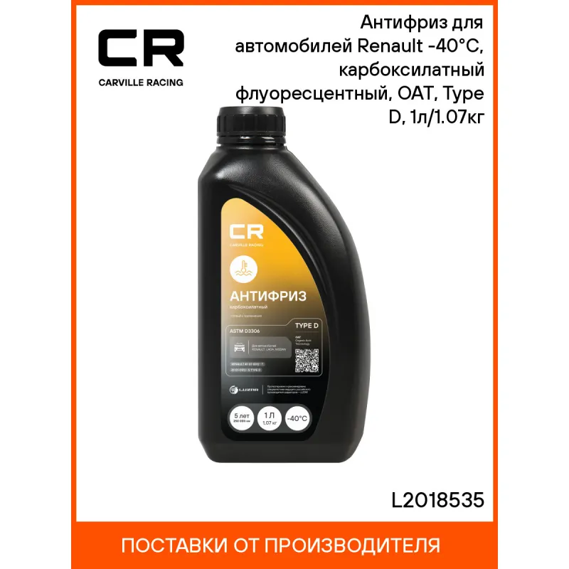 Антифриз для автомобилей Renault (Lada, Nissan) -40°С, карбоксилатный флуоресцентный, OAT, Type D, 1л/1.07кг Описание: Флуоресцентный карбоксилатный антифриз премиум класса бренда Carville Racing в желтом цвете цвете обеспечивает надежную защиту системы охлаждения вашего автомобиля от негативных воздействий и обеспечивает стойкость деталей техники к высоким температурам. Созданная по самой современной лобридной технологии производства OAT (Organic Acid Technology) охлаждающая жидкость в объеме. Защитный антифриз подходит для сервисного обслуживания и дальнейшей эксплуатации любых марок машин, в том числе с бензиновым двигателем, в соответствии со спецификацией, в том числе таких как Renault и других автомобилей. Совместим с элементами из пластика, эластомеров или резины. Позволяет увеличить время эксплуатации термостата и водяного насоса. Это эффективное решение для автомобильных систем охлаждения в условиях экстремальных эксплуатационных нагрузок в любое время года зимнее, осеннее, весеннее и летнее. Незаменимый автотовар обеспечивает идеальную защиту от коррозии и перегрева в самых сложных условиях эксплуатации, что делает его отличным выбором для автовладельцев. Характеристики: Артикул: L2018535 OEM номера: 7711428133, 7711428130, 7711428129, 7711428132 Цвет: Желтый Тип: Карбоксилатный антифриз Состав: Этиленгликоль, пакет многофункциональных присадок, вода деминерализованная, противопенные добавки, краситель. Не содержит метанол и глицерин Срок эксплуатации: 5 лет или 250 000 км Гарантийный срок хранения: 5 лет Соответствие требованиям/стандартам: ASTM D3306 Спецификации: Renault 41-01-001/--T, 41-01-001/--S Type D Температура начала кристаллизации, °С: минус 40 Температура начала кипения, °C: плюс 110 Температура начала кипения при 2Атм, °С: плюс 127 Температура замерзания, °С: минус 43 Объём / Нетто / Брутто: 1л / 1,07кг / 1,14кг Применение: Продукт готов к применению. Пожаровзрывобезопасен Технология производства: OAT (Organic Acid Technology) Водородный показатель (рН): 8.3 Флуоресцентный краситель: Да Подходит для авто: Renault Kaptur (16-), Duster II (21-), Logan (04-), Logan (08-), Logan II (12-), Duster (10-) Nissan Terrano (14-), Almera G15 (12-) ВАЗ Largus (12-), X-Ray (15-), Vesta (15-) Для проверки применяемости отправьте VIN автомобиля через вкладку "Есть вопросы о товаре?" Комплектация: Жидкость охлаждающая - 1 шт Гарантия: от 1 года.