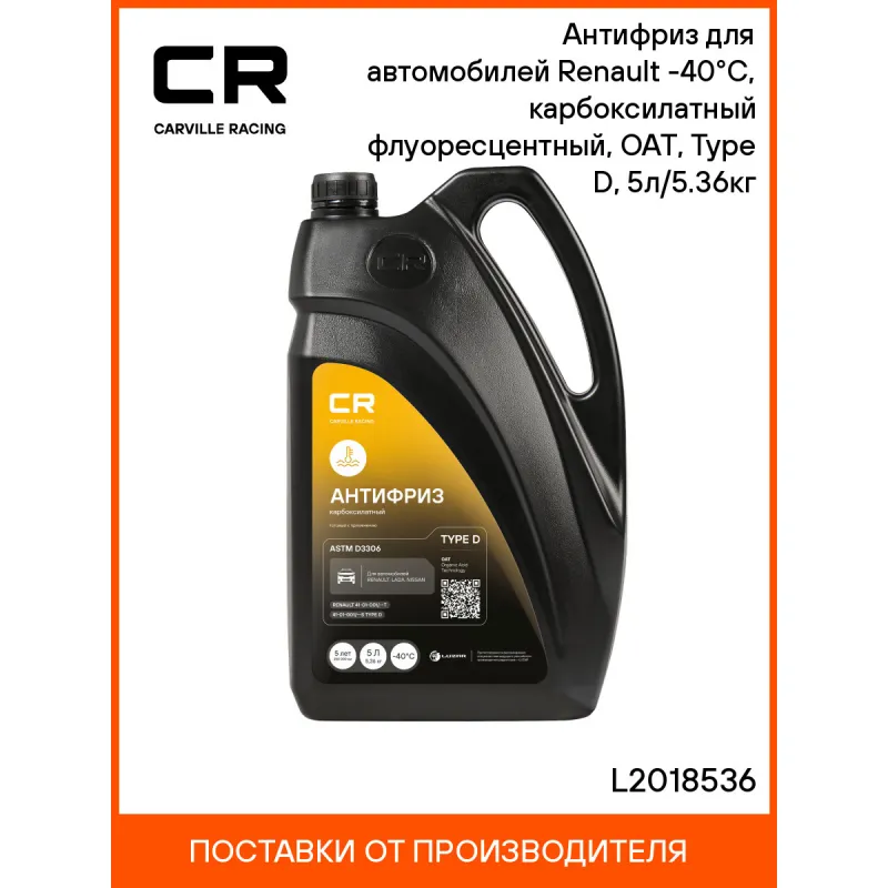 Антифриз для автомобилей Renault (Lada, Nissan) -40°С, карбоксилатный флуоресцентный, OAT, Type D, 5л/5.36кг Описание: Флуоресцентный карбоксилатный антифриз премиум класса бренда Carville Racing в желтом цвете цвете обеспечивает надежную защиту системы охлаждения вашего автомобиля от негативных воздействий и обеспечивает стойкость деталей техники к высоким температурам. Созданная по самой современной лобридной технологии производства OAT (Organic Acid Technology) охлаждающая жидкость в объеме. Защитный антифриз подходит для сервисного обслуживания и дальнейшей эксплуатации любых марок машин, в том числе с бензиновым двигателем, в соответствии со спецификацией, в том числе таких как Renault и других автомобилей. Совместим с элементами из пластика, эластомеров или резины. Позволяет увеличить время эксплуатации термостата и водяного насоса. Это эффективное решение для автомобильных систем охлаждения в условиях экстремальных эксплуатационных нагрузок в любое время года зимнее, осеннее, весеннее и летнее. Незаменимый автотовар обеспечивает идеальную защиту от коррозии и перегрева в самых сложных условиях эксплуатации, что делает его отличным выбором для автовладельцев. Характеристики: Артикул: L2018536 OEM номера: 7711428133, 7711428130, 7711428129, 7711428132 Цвет: Желтый Тип: Карбоксилатный антифриз Состав: Этиленгликоль, пакет многофункциональных присадок, вода деминерализованная, противопенные добавки, краситель. Не содержит метанол и глицерин Срок эксплуатации: 5 лет или 250 000 км Гарантийный срок хранения: 5 лет Соответствие требованиям/стандартам: ASTM D3306 Спецификации: Renault 41-01-001/--T, 41-01-001/--S Type D Температура начала кристаллизации, °С: минус 40 Температура начала кипения, °C: плюс 110 Температура начала кипения при 2Атм, °С: плюс 127 Температура замерзания, °С: минус 43 Объём / Нетто / Брутто: 5л / 5,36кг / 5,61кг Применение: Продукт готов к применению. Пожаровзрывобезопасен Технология производства: OAT (Organic Acid Technology) Водородный показатель (рН): 8.3 Флуоресцентный краситель: Да Цвет: Желтый Подходит для авто: Renault Logan (04-), Duster II (21-), Kaptur (16-), Logan (08-), Logan II (12-), Duster (10-) Nissan Terrano (14-), Almera G15 (12-) ВАЗ Largus (12-), Vesta (15-), X-Ray (15-) Для проверки применяемости отправьте VIN автомобиля через вкладку "Есть вопросы о товаре?" Комплектация: Жидкость охлаждающая - 1 шт Гарантия: от 1 года.