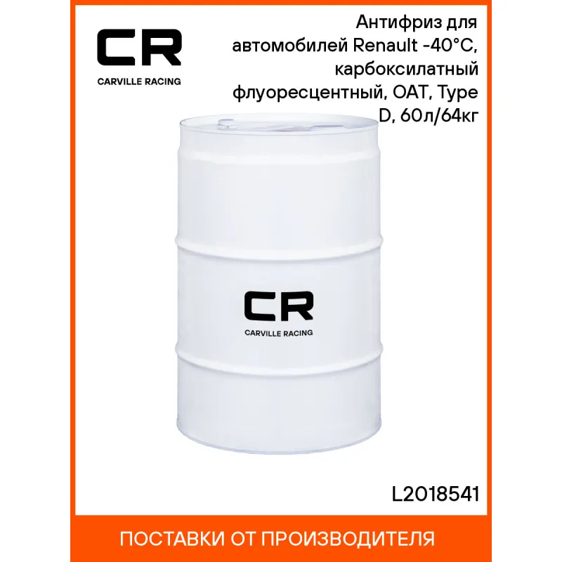 Антифриз для автомобилей Renault (Lada, Nissan) -40°С, карбоксилатный флуоресцентный, OAT, Type D, 60л/64кг Описание: Охлаждающая низкозамерзающая жидкость Антифриз Carville Racing изготовлена по карбоксилатной технологии OAT (Organic Acid Technology), на основе моноэтиленгликоля высшего сорта и комплекса солей карбоновых кислот в соответствии с требованиями спецификации Renault 41-01-001/- -T Type D. Применяется в системе охлаждения легковых и грузовых автомобилей, эксплуатируемых при температуре окружающей среды до минус 40 °С. Рекомендуется к использованию в системах охлаждения автомобилей Renault, Lada, Nissan. Обладает длительным сроком службы – 5 лет или 250000 км пробега. Содержит флуоресцентный краситель для индикации мест протечек в ультрафиолетовом свете. Характеристики: Артикул: L2018541 OEM номера: 7711428133, 7711428132, 7711428129, 7711428130 Цвет: Желтый Тип: Карбоксилатный антифриз Состав: Этиленгликоль, пакет многофункциональных присадок, вода деминерализованная, противопенные добавки, краситель. Не содержит метанол и глицерин Срок эксплуатации: 5 лет или 250 000 км Гарантийный срок хранения: 5 лет Соответствие требованиям/стандартам: ASTM D3306 Спецификации: Renault 41-01-001/--T, 41-01-001/--S Type D Температура начала кристаллизации, °С: минус 40 Температура начала кипения, °C: плюс 110 Температура начала кипения при 2Атм, °С: плюс 127 Температура замерзания, °С: минус 43 Объём / Нетто / Брутто: 60л / 64кг / 68кг Применение: Продукт готов к применению. Пожаровзрывобезопасен Технология производства: OAT (Organic Acid Technology) Водородный показатель (рН): 8.3 Флуоресцентный краситель: Да Комплектация: Жидкость охлаждающая - 1 шт Гарантия: от 1 года.
