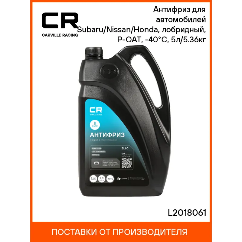 Антифриз для автомобилей Subaru/Nissan/Honda, лобридный, P-OAT, -40°С, 5л/5.36кг Описание: Флуоресцентный антифриз премиум класса бренда Carville Racing в голубом цвете обеспечивает надежную защиту системы охлаждения вашего автомобиля от негативных воздействий и обеспечивает стойкость деталей техники к высоким температурам. Созданная по самой современной лобридной технологии производства Р-OAT (Phosphate Organic Acid Technology) охлаждающая жидкость в объеме. Не содержит метанол и глицерин. Защитный антифриз подходит для сервисного обслуживания и дальнейшей эксплуатации любых марок машин, в том числе с бензиновым двигателем, в соответствии со спецификацией, в том числе таких как Subaru, Nissan, Honda и других автомобилей в соответствии со спецификацией. Рекомендуется к применению в системах охлаждения легковых и грузовых автомобилей японских автопроизводителей: Subaru, Nissan, Honda, Suzuki, Infiniti, Datsun, Acura и других. Совместим с элементами из пластика, эластомеров или резины. Позволяет увеличить время эксплуатации термостата и водяного насоса. Это эффективное решение для автомобильных систем охлаждения в условиях экстремальных эксплуатационных нагрузок в любое время года зимнее, осеннее, весеннее и летнее. Незаменимый автотовар обеспечивает идеальную защиту от коррозии и перегрева в самых сложных условиях эксплуатации, что делает его отличным выбором для автовладельцев. Характеристики: Артикул: L2018061 OEM номера: K067EYA000, 990F0ECSC2005, 08CLAG026L1 Цвет: Голубой Тип: Лобридный антифриз Состав: Этиленгликоль, пакет многофункциональных присадок, вода деминерализованная, противопенные добавки, краситель. Не содержит метанол и глицерин Срок эксплуатации: В соответствии с инструкцией по эксплуатации автомобиля. Не менее 5 лет или 250 000 км Гарантийный срок хранения: 5 лет Соответствие требованиям/стандартам: ASTM D3306, ASTM D6210, JIS K 2234 Class II, KS M 2142 Спецификации: Subaru Super Coolant, Nissan Coolant L248, L250, L255, Honda Long Life Coolant Type 2. Температура начала кристаллизации, °С: минус 40 Температура начала кипения, °C: плюс 110 Температура начала кипения при 2Атм, °С: плюс 127 Температура замерзания, °С: минус 43 Объём / Нетто / Брутто: 5л / 5,36кг / 5,61кг Применение: Продукт готов к применению. Пожаровзрывобезопасен Технология производства: Р-OAT (Phosphate Organic Acid Technology) Водородный показатель (рН): 8.2 Флуоресцентный краситель: Нет Комплектация: Жидкость охлаждающая - 1 шт Гарантия: от 1 года.