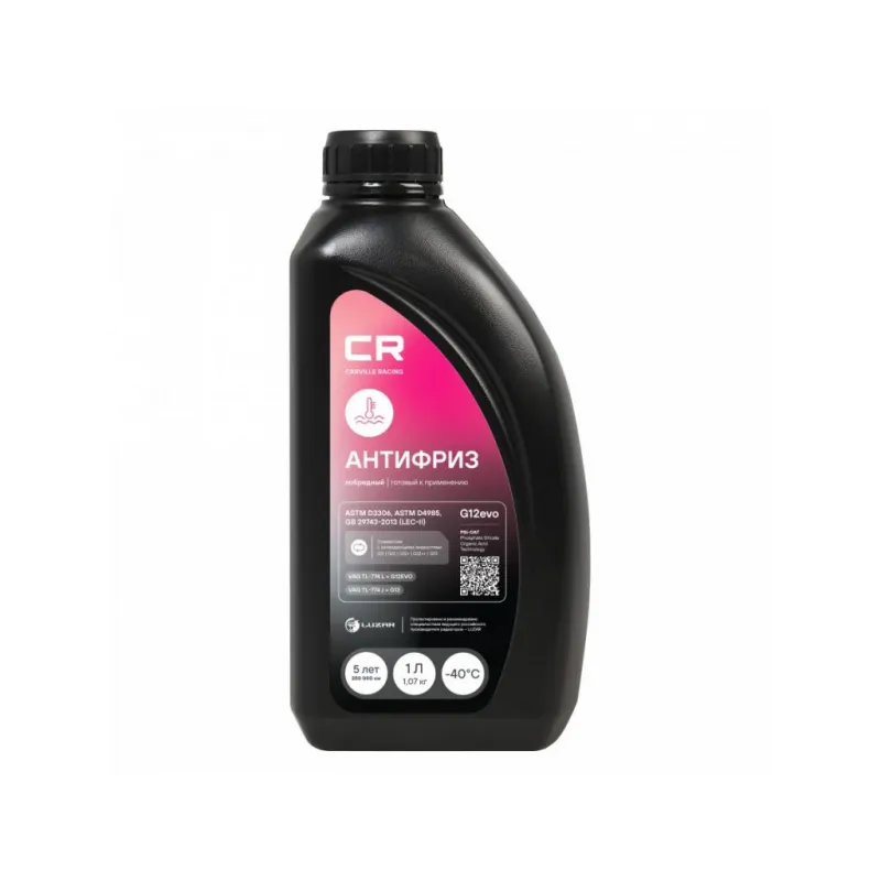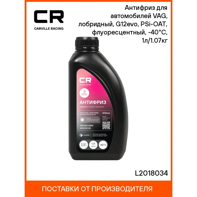 Антифриз для автомобилей VAG, лобридный, G12evo, PSi-OAT, флуоресцентный, -40°С, 1л/1.07кг Описание: Флуоресцентный лобридный антифриз премиум класса бренда Carville Racing в фиолетовом цвете обеспечивает надежную защиту системы охлаждения вашего автомобиля от негативных воздействий и обеспечивает стойкость деталей техники к высоким температурам. Охлаждающая низкозамерзающая жидкость Антифриз CARVILLE RACING лобридный изготовлена по PSi-OAT технологии (Phosphate Silicate Organic Acid Technology), на основе моноэтиленгликоля высшего сорта и комплекса карбоксилатных, силикатных и фосфатных ингибиторов, в соответствии с требованиями спецификации концерна Volkswagen TL 774-L (G12evo). Рекомендуется к применению в системах охлаждения автомобилей Audi, Skoda, Volkswagen, Porsche, Seat, Bentley, Bugatti, Lamborghini и многих других. Совместим с элементами из пластика, эластомеров или резины. Это эффективное решение для автомобильных систем охлаждения в условиях экстремальных эксплуатационных нагрузок в любое время года зимнее, осеннее, весеннее и летнее. Незаменимый автотовар обеспечивает идеальную защиту от коррозии и перегрева в самых сложных условиях эксплуатации, что делает его отличным выбором для автовладельцев. Характеристики: Артикул: L2018034 OEM номера: G013A8JM1, G12E050A2 Особенности конструкции: Флуоресцентный краситель – индикация утечек в ультрафиолетовом свете Цвет: Розовый Тип: Лобридный антифриз Состав: Этиленгликоль, пакет многофункциональных присадок, вода деминерализованная, противопенные добавки, краситель. Не содержит метанол и глицерин Срок эксплуатации: В соответствии с инструкцией по эксплуатации автомобиля. Не менее 5 лет или 250 000 км Гарантийный срок хранения: 5 лет Соответствие требованиям/стандартам: ASTM D3306, ASTM D4985, GB 29743-2013 (LEC-II) Спецификации: VAG TL-774 L = G12evo, VAG TL-774 J = G13 Температура начала кристаллизации, °С: минус 40 Температура начала кипения, °C: плюс 110 Температура начала кипения при 2Атм, °С: плюс 127 Температура замерзания, °С: минус 43 Объём / Нетто / Брутто: 1л / 1,07кг / 1,14кг Применение: Продукт готов к применению. Пожаровзрывобезопасен Технология производства: PSi-OAT Водородный показатель (рН): 8.2 Флуоресцентный краситель: Да Комплектация: Жидкость охлаждающая - 1 шт Гарантия: от 1 года.