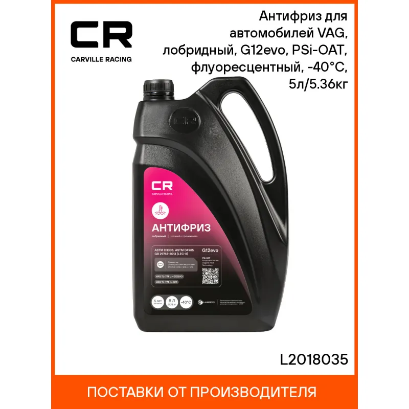 Антифриз для автомобилей VAG, лобридный, G12evo, PSi-OAT, флуоресцентный, -40°С, 5л/5.36кг Описание: Флуоресцентный лобридный антифриз премиум класса бренда Carville Racing в фиолетовом цвете обеспечивает надежную защиту системы охлаждения вашего автомобиля от негативных воздействий и обеспечивает стойкость деталей техники к высоким температурам. Охлаждающая низкозамерзающая жидкость Антифриз CARVILLE RACING лобридный изготовлена по PSi-OAT технологии (Phosphate Silicate Organic Acid Technology), на основе моноэтиленгликоля высшего сорта и комплекса карбоксилатных, силикатных и фосфатных ингибиторов, в соответствии с требованиями спецификации концерна Volkswagen TL 774-L (G12evo). Рекомендуется к применению в системах охлаждения автомобилей Audi, Skoda, Volkswagen, Porsche, Seat, Bentley, Bugatti, Lamborghini и многих других. Совместим с элементами из пластика, эластомеров или резины. Это эффективное решение для автомобильных систем охлаждения в условиях экстремальных эксплуатационных нагрузок в любое время года зимнее, осеннее, весеннее и летнее. Незаменимый автотовар обеспечивает идеальную защиту от коррозии и перегрева в самых сложных условиях эксплуатации, что делает его отличным выбором для автовладельцев. Характеристики: Артикул: L2018035 OEM номера: G12E100M2 Особенности конструкции: Флуоресцентный краситель – индикация утечек в ультрафиолетовом свете Цвет: Розовый Тип: Лобридный антифриз Состав: Этиленгликоль, пакет многофункциональных присадок, вода деминерализованная, противопенные добавки, краситель. Не содержит метанол и глицерин Срок эксплуатации: В соответствии с инструкцией по эксплуатации автомобиля. Не менее 5 лет или 250 000 км Гарантийный срок хранения: 5 лет Соответствие требованиям/стандартам: ASTM D3306, ASTM D4985, GB 29743-2013 (LEC-II) Спецификации: VAG TL-774 L = G12evo, VAG TL-774 J = G13 Температура начала кристаллизации, °С: минус 40 Температура начала кипения, °C: плюс 110 Температура начала кипения при 2Атм, °С: плюс 127 Температура замерзания, °С: минус 43 Объём / Нетто / Брутто: 5л / 5,36кг / 5,61кг Применение: Продукт готов к применению. Пожаровзрывобезопасен Технология производства: PSi-OAT Водородный показатель (рН): 8.2 Флуоресцентный краситель: Да Цвет: Фиолетовый Комплектация: Жидкость охлаждающая - 1 шт Гарантия: от 1 года.