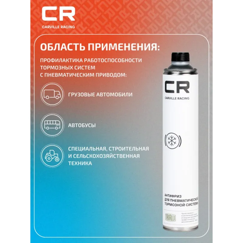 Антифриз для пневматической тормозной системы, 1000ml Описание: Антифриз для пневмотормозов Carville Racing – препарат для комплексной защиты пневматических тормозных систем от появления и замерзания конденсата, образования коррозии, затвердевания резиновых уплотнителей и шлангов, засорения и блокировки пневмоклапанов в условиях низких температур (до -50 °С). Обеспечивает бесперебойную работу тормозной системы в любых погодных условиях. Применяется в тормозных системах грузовых автомобилей, автобусов, специальной, строительной и сельскохозяйственной технике. Характеристики: Артикул: W0521002 Гарантийный срок хранения: 5 лет Объём / Нетто / Брутто: 1000мл / 750г / 875г Область применения: Применяется в тормозных системах грузовых автомобилей, автобусов, специальной, строительной и сельскохозяйственной технике. Состав: абсолютированный изопропиловый спирт >30%, этандиол