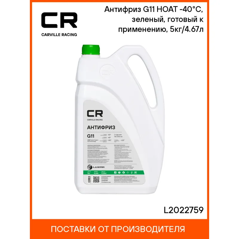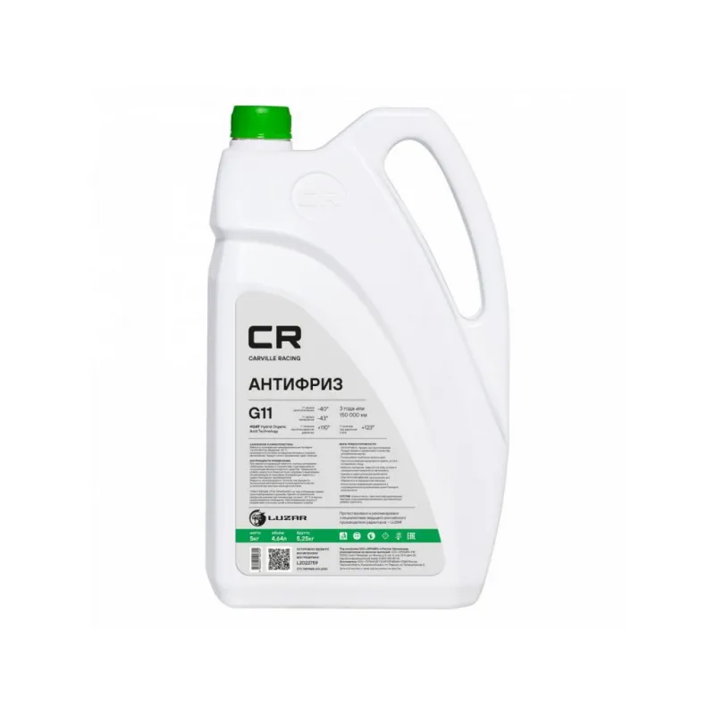 Антифриз G11 HOAT -40°С, зеленый, готовый к применению, 5кг/4.67л Описание: Гибридный антифриз премиум класса бренда Carville Racing безупречная защита двигателя от перегрева и коррозии. Охлаждающая жидкость G11 в зеленом цвете обеспечивает надежную защиту системы охлаждения вашего автомобиля от негативных воздействий и обеспечивает стойкость деталей техники к высоким температурам. HOAT (Hybrid Organic Acid Technology) на основе этиленгликоля высшего сорта, комплекса силикатных присадок и карбоновых солей, в соответствии с требованиями спецификации Volkswagen TL 774-С (G11). Прозрачный корпус расширительного бачка и яркий флуоресцентный краситель позволяет обеспечить визуальный контроль уровня заливки автохимиката и индикацию утечек. Защитный антифриз подходит для сервисного обслуживания и дальнейшей эксплуатации любых марок машин, в том числе с бензиновым двигателем, в соответствии со спецификацией. Зеленый цвет делает продукт отличительным от других автотоваров и облегчает контроль за уровнем залива. Характеристики: Артикул: L2022759 OEM номера: 0009890825, 0009890825S1, 0710000200, 0710000400, 1047035, 1940656, 5016436, 5016437, 5016438, 81229407181, 81229407454, 81229407755, 82141467704, 83192179987, 83192211191, 83192211195, 83192211358, 83192211913, 83192304069, 83512355290, 88888400005082, 90297545, 93740140, 93740141, 9890825, A0009890825, A000989082510, A000989082511, G0011V8A1, G011A8CA1, G011V8BA1 Цвет: Зеленый Тип: Гибридный антифриз Объём / Нетто / Брутто: 4,64л / 5кг / 5,25кг Технология производства: HOAT (Hybrid Organic Acid Technology) Флуоресцентный краситель: Нет Срок эксплуатации: 3 года или 150 000 км Гарантийный срок хранения: 5 лет Соответствие требованиям/стандартам: ASTM D3306, JIS K2234, SAE J1034 Спецификации: VAG TL-774 C (G 11), Deutz DQC CA-14, Alfa Romeo / Fiat-Lancia / Lancia Fiat 9,55523, MAN 324 Typ NF, Chrysler MS-7170, Iveco standard 18-1830, Ford ESD-M97B49-A, General Motors, B 040 0240, Opel-GM GME L1301, Saturn, Volvo 1286083, BMW N 600.69.0, АВТОВАЗ TTM VAZ 1.97.717-97 Температура начала кристаллизации, °С: минус 40 Температура начала кипения, °C: плюс 110 Температура начала кипения при 2Атм, °С: плюс 123 Температура замерзания, °С: минус 43 Состав: Этиленгликоль, пакет многофункциональных присадок, вода деминерализованная, противопенные добавки, краситель. Не содержит метанол и глицерин Применение: Продукт готов к применению. Пожаровзрывобезопасен Водородный показатель (рН): 8.1 Комплектация: Жидкость охлаждающая - 1 шт Гарантия: от 1 года.