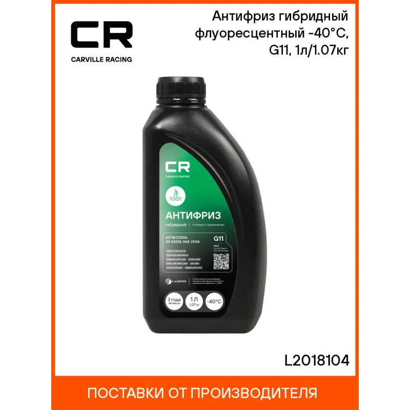 Антифриз гибридный флуоресцентный -40°С, G11, 1л/1.07кг Описание: Флуоресцентный антифриз премиум класса от бренда Carville Racing - безупречная защита двигателя от перегрева и коррозии. Охлаждающая жидкость G11 в зеленом цвете обеспечивает надежную защиту системы охлаждения вашего автомобиля от негативных воздействий и обеспечивает стойкость деталей техники к высоким температурам. Созданная по самой современной лобридной технологии производства HOAT (Hybrid Organic Acid Technology) охлаждающая жидкость в объеме. Не содержит метанол и глицерин. Прозрачный корпус расширительного бачка и яркий флуоресцентный краситель позволяет обеспечить визуальный контроль уровня заливки автохимиката и индикацию утечек в ультрафиолетовом свете, что облегчает процесс его использования. Защитный антифриз подходит для сервисного обслуживания и дальнейшей эксплуатации любых марок машин, в том числе с бензиновым двигателем, в соответствии со спецификацией, в том числе таких как Deutz Alfa Romeo, Fiat-Lancia, Iveco, Ford, Opel, Volvo, BMW, Lada, Audi, Porsche, Seat, Skoda, Volkswagen и других автомобилей. Используется в соответствии с инструкцией по эксплуатации автомобиля (не менее 150 000 километров или трех лет). Совместим с элементами из пластика, эластомеров или резины. Позволяет увеличить время эксплуатации термостата и водяного насоса. Защитите ваш автомобиль от перегрева и коррозии уже сегодня с универсальным автотоваром - антифризом G11! Это эффективное решение для автомобильных систем охлаждения в условиях экстремальных эксплуатационных нагрузок в любое время года: зимнее, осеннее, весеннее и летнее. Зеленый цвет делает продукт отличительным от других автотоваров и облегчает контроль за уровнем залива. Незаменимый автотовар обеспечивает идеальную защиту от коррозии и перегрева в самых сложных условиях эксплуатации, что делает его отличным выбором для автовладельцев. Не рискуйте безопасностью эксплуатации своего автомобиля, выбирайте антифриз G11 для надежной защиты системы охлаждения вашей машинки. Товар от производителя. Характеристики: Артикул: L2018104 OEM номера: 83512355290, 83192304069, 93740140, 93740141, A000989082510, A000989082511, 88888400001082, 82141467704, 5016438, 1047035, 0009890825, 1940656, G011A8CA1, 5016436, 5016437, A0009890825, 9890825, 0009890825S1, 81229407181, 81229407454, 81229407755, 83192211191, 83192179987, 83192211195, 83192211358, 83192211913, 90297545, G011V8BA1, G0011V8A1 Тип: Гибридный антифриз Срок эксплуатации: 3 года или 150 000 км Гарантийный срок хранения: 5 лет Соответствие требованиям/стандартам: ASTM D3306, JIS K2234, SAE J1034 Цвет: Зеленый Спецификации: VAG TL-774 C (G 11), Deutz DQC CA-14, Alfa Romeo / Fiat-Lancia / Lancia Fiat 9,55523, MAN 324 Typ NF, Chrysler MS-7170, Iveco standard 18-1830, Ford ESD-M97B49-A, General Motors, B 040 0240, Opel-GM GME L1301, Saturn, Volvo 1286083, BMW N 600.69.0, АВТОВАЗ TTM VAZ 1.97.717-97 Температура начала кристаллизации, °С: минус 40 Температура начала кипения, °C: плюс 110 Температура начала кипения при 2Атм, °С: плюс 123 Температура замерзания, °С: минус 43 Состав: Этиленгликоль, пакет многофункциональных присадок, вода деминерализованная, противопенные добавки, краситель. Не содержит метанол и глицерин Объём / Нетто / Брутто: 1л / 1,07кг / 1,14кг Применение: Продукт готов к применению. Пожаровзрывобезопасен Технология производства: HOAT (Hybrid Organic Acid Technology) Водородный показатель (рН): 8.1 Флуоресцентный краситель: Да Комплектация: Жидкость охлаждающая - 1 шт Гарантия: от 1 года.