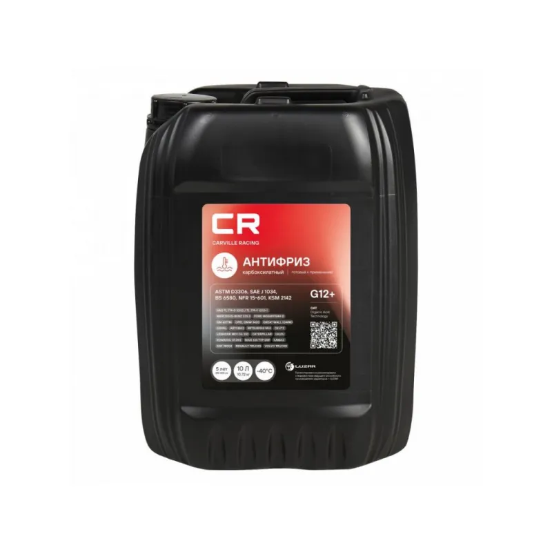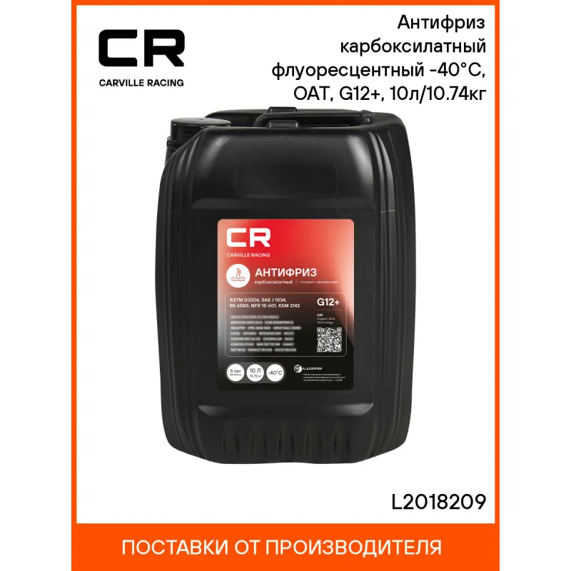 Антифриз карбоксилатный флуоресцентный -40°С, OAT, G12+, 10л/10.74кг Описание: Флуоресцентный антифриз премиум класса бренда Carville Racing - безупречная защита двигателя от перегрева и коррозии. Охлаждающая жидкость G12+ в красном цвете обеспечивает надежную защиту системы охлаждения вашего автомобиля от негативных воздействий и обеспечивает стойкость деталей техники к высоким температурам. Созданная по самой современной карбоксилатной технологии производства OAT (Organic Acid Technology) охлаждающая жидкость в объеме. Прозрачный корпус расширительного бачка и яркий флуоресцентный краситель позволяет обеспечить визуальный контроль уровня заливки автохимиката и индикацию утечек в ультрафиолетовом свете, что облегчает процесс его использования. Защитный антифриз подходит для сервисного обслуживания и дальнейшей эксплуатации любых марок машин, в том числе с бензиновым двигателем, в соответствии со спецификацией. Используется в соответствии с инструкцией по эксплуатации автомобиля (не менее 250 000 километров или пяти лет). Красный цвет делает продукт отличительным от других автотоваров и облегчает контроль за уровнем залива. Характеристики: Артикул: L2018209 OEM номера: 9735K1, 9735K0, 9735Y5, 1336797, 1326830, 93170402, 93742646, 93742647, 93165162, 1940663, 1940678, G012A8FA1, G012A8FM1, 88888100010082, G012A8DA1, B715110, 1020121, 1047034, 1047036, 1057614, 1057615, 1057616, 1113805, 1209795, 1209799, 1209800, 1222110, 1222116, 83192211662, 83510406720, JLM209722, 9437600, 1129700, 1188500, 1333754, 1381023, 1381025, 1381076, A0009891625, 9891625 Тип: Карбоксилатный антифриз Срок эксплуатации: 5 лет или 250 000 км Гарантийный срок хранения: 5 лет Соответствие требованиям/стандартам: ASTM D3306, SAE J 1034, BS 6580, NFR 15-601, KSM 2142 Цвет: Красный Спецификации: VAG TL 774-D (G12) / TL 774-F (G12+), Mercedes-Benz MB-Approval 325.3, Ford WSSM97B44-D, GM Chevrolet, GM 6277M, Opel GMW 3420, Great Wall (GWM), HAVAL, Renault-Nissan 41-01-001/--S Type D, АВТОВАЗ, Mitsubishi MHI, Liebherr MD1-36-130, Deutz, Caterpillar, Cummins CES 14439 / IS N14, Isuzu, Komatsu 07.892, MTU, MAN 324 Typ SNF, DAF 74002, Renault Trucks, Volvo Penta/Trucks/Bus/Construction, КАМАЗ, ЛиАЗ. Температура начала кристаллизации, °С: минус 40 Температура начала кипения, °C: плюс 112 Температура начала кипения при 2Атм, °С: плюс 129 Температура замерзания, °С: минус 43 Состав: Этиленгликоль, пакет многофункциональных присадок, вода деминерализованная, противопенные добавки, краситель. Не содержит метанол и глицерин Объём / Нетто / Брутто: 10л / 10,72кг / 11,05кг Применение: Продукт готов к применению. Пожаровзрывобезопасен Технология производства: OAT (Organic Acid Technology) Водородный показатель (рН): 8.3 Флуоресцентный краситель: Да Комплектация: Жидкость охлаждающая - 1 шт Гарантия: от 1 года.