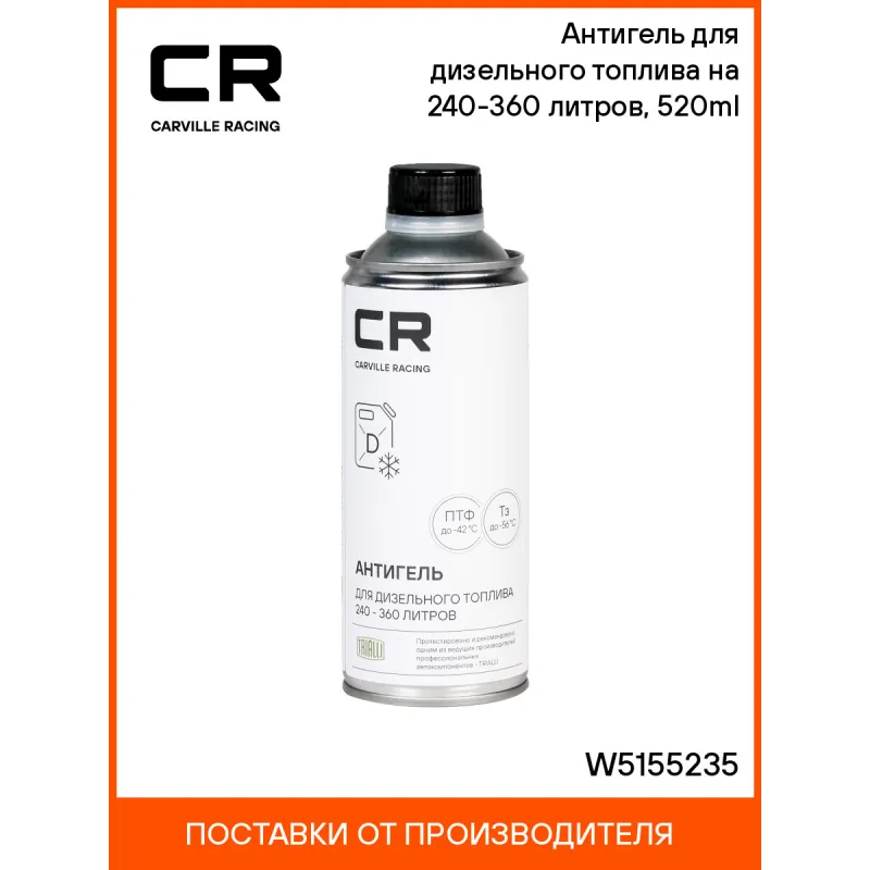 Антигель для дизельного топлива на 240-360 литров, 520ml Описание: Современная комплексная депрессорно-диспергирующая присадка. Предотвращает замерзание дизельного топлива, блокирует рост кристаллов парафинов и препятствует образованию парафиновых отложений в фильтрах и других элементах топливной системы. Это позволяет поддерживать свободную циркуляцию топлива в магистрали и свободное прохождение через фильтры. Содержит в составе комплекс смазывающих добавок и продлевает срок службы насоса высокого давления и форсунок впрыска. Характеристики: Артикул: W5155235 Дозировка: 1 флакон для обработки 240-360 литров топлива Объём / Нетто / Брутто: 520мл / 415г / 498г Состав: ароматические углеводороды >30%, нафтеновые углеводороды