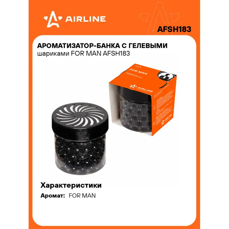 Ароматизатор-банка с гелевыми шариками FOR MAN Описание: Ароматизатор для автомобиля - банка с гелевыми шариками "FOR MAN" от AFSH183 - универсальный ароматизатор для дома и авто, который можно расположить в любом удобном месте. Банка с гелевыми шариками - это не только очень эффективный ароматизатор, но и украшение салона автомобиля. Банку можно использовать и в подcтаканнике, и закрепить на панели приборов. Гелевые шарики AIRLINE самые ярко и долгопахнущие за счет самого высокого содержания отдушки. Банка: 100 мл. ВНИМАНИЕ: не оставлять под прямыми солнечными лучами. Аромат качественного парфюма для настоящих мужчин. Знакомый и ненавязчивый аромат для создания приятной атмосферы и подавления неприятных запахов. Особенности: - Варианты крепления: подвесной, на зеркало, в бардачок, на солнцезащитный козырек, под сиденье, в гардеробе, в шкаф, для дома; - Состав - вода, отдушка, эмульгатор, АИПС, гидрогель, краситель, консервант; - Универсальный - подходит для мужчин и женщин; - Не содержит спирт; Товар официального производителя AIRLINE. Духи в машину - это мини диффузор с автопарфюмом, который подарит свежесть и приятный аромат салону вашего автомобиля. Ароматизатор для машины в салон или для дома станет отличным подарком автомобилисту, мужчине и женщине, автолюбителю, папе, отцу, мужу, парню и другу на день рождения, 23 февраля, Новый год или любой другой праздник. Характеристики: Артикул: AFSH183 Аромат: FOR MAN Объем, мл: 100 Комплектация: Ароматизатор в картонном рукаве - 1 шт Гарантия: от 1 года.