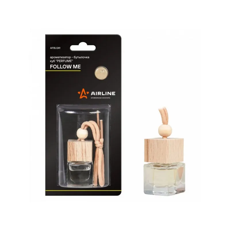 Ароматизатор-бутылочка куб "Perfume" FOLLOW ME Описание: Ароматизатор для автомобиля - подвесной бутылочка куб "Perfume" "FOLLOW ME" от AFBU241 - универсальный ароматизатор для дома и авто, который можно расположить в любом удобном месте. Ароматизатор представляет собой подвесную бутылочку футляр с парфюмом. Завораживающий и интригующий аромата на основе нот розового пиона, личи, белого чая, жасмина, ананаса, мускуса и сандала. Знакомый и ненавязчивый аромат для создания приятной атмосферы и подавления неприятных запахов. Особенности: - Варианты крепления: подвесной, на зеркало, в бардачок, на солнцезащитный козырек, под сиденье, в гардеробе, в шкаф, для дома; - Состав - парфюмерная композиция, стекло, дерево; - Универсальный - подходит для мужчин и женщин; - Не содержит спирт; Товар официального производителя AIRLINE. Духи в машину - это мини диффузор с автопарфюмом, который подарит свежесть и приятный аромат салону вашего автомобиля. Ароматизатор для машины в салон или для дома станет отличным подарком автомобилисту, мужчине и женщине, автолюбителю, папе, отцу, мужу, парню и другу на день рождения, 23 февраля, Новый год или любой другой праздник. Характеристики: Артикул: AFBU241 Аромат: FOLLOW ME Объем, мл: 6 Комплектация: Ароматизатор в блистерной упаковке - 1 шт Гарантия: от 1 года.