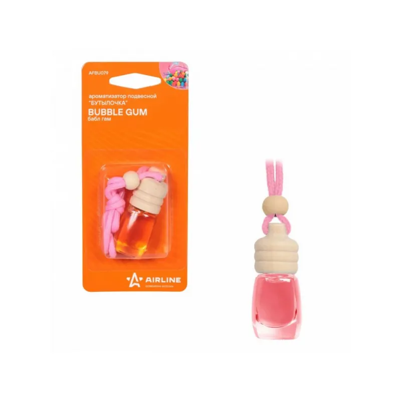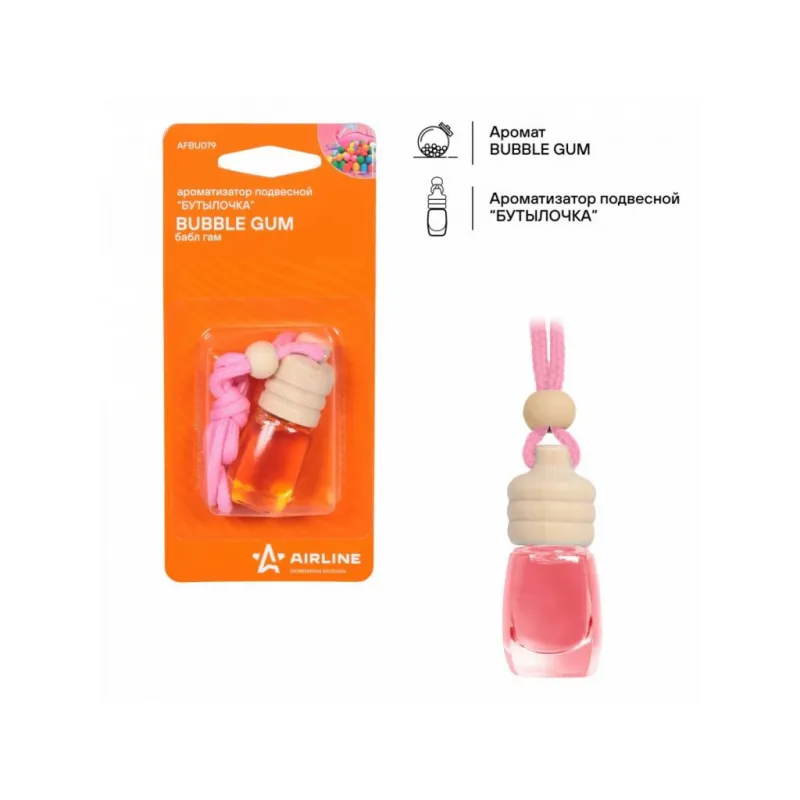 Ароматизатор подвесной "Бутылочка" Бабл гам Описание: Ароматизатор для автомобиля - подвесной Бутылочка "Бабл гам" от AFBU079 - универсальный ароматизатор для дома и авто, который можно расположить в любом удобном месте. Ароматизатор "Бутылочка" - абсолютный ХИТ продаж. Лаконичный дизайн: стеклянный флакон и деревянная крышечка. Интенсивность аромата регулируется самостоятельно. Аромат до 45 дней! Яркий аромат из детства со вкусом фруктовой жвачки дарит ощущение радости, бодрости и хорошего настроения. Знакомый и ненавязчивый аромат для создания приятной атмосферы и подавления неприятных запахов. Особенности: - Варианты крепления: подвесной, на зеркало, в бардачок, на солнцезащитный козырек, под сиденье, в гардеробе, в шкаф, для дома; - Состав - парфюмированная жидкость, стекло, дерево; - Универсальный - подходит для мужчин и женщин; - Не содержит спирт; Товар официального производителя AIRLINE. Духи в машину - это мини диффузор с автопарфюмом, который подарит свежесть и приятный аромат салону вашего автомобиля. Ароматизатор для машины в салон или для дома станет отличным подарком автомобилисту, мужчине и женщине, автолюбителю, папе, отцу, мужу, парню и другу на день рождения, 23 февраля, Новый год или любой другой праздник. Характеристики: Артикул: AFBU079 Аромат: Бабл гам Объем, мл: 5 Комплектация: Ароматизатор в блистерной упаковке - 1 шт Гарантия: от 1 года.