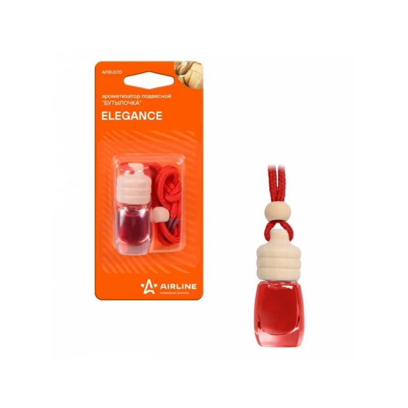 Ароматизатор подвесной "Бутылочка" Elegance Описание: Ароматизатор для автомобиля - подвесной Бутылочка "Elegance" от AFBU070 - универсальный ароматизатор для дома и авто, который можно расположить в любом удобном месте. Ароматизатор "Бутылочка" - абсолютный ХИТ продаж. Лаконичный дизайн: стеклянный флакон и деревянная крышечка. Интенсивность аромата регулируется самостоятельно. Аромат до 45 дней! Тонкий волнующий аромат парфюма устранит неприятные запахи в салоне. Знакомый и ненавязчивый аромат для создания приятной атмосферы и подавления неприятных запахов. Особенности: - Варианты крепления: подвесной, на зеркало, в бардачок, на солнцезащитный козырек, под сиденье, в гардеробе, в шкаф, для дома; - Состав - парфюмированная жидкость, стекло, дерево; - Универсальный - подходит для мужчин и женщин; - Не содержит спирт; Товар официального производителя AIRLINE. Духи в машину - это мини диффузор с автопарфюмом, который подарит свежесть и приятный аромат салону вашего автомобиля. Ароматизатор для машины в салон или для дома станет отличным подарком автомобилисту, мужчине и женщине, автолюбителю, папе, отцу, мужу, парню и другу на день рождения, 23 февраля, Новый год или любой другой праздник. Характеристики: Артикул: AFBU070 Аромат: Elegance Объем, мл: 5 Комплектация: Ароматизатор в блистерной упаковке - 1 шт Гарантия: от 1 года.