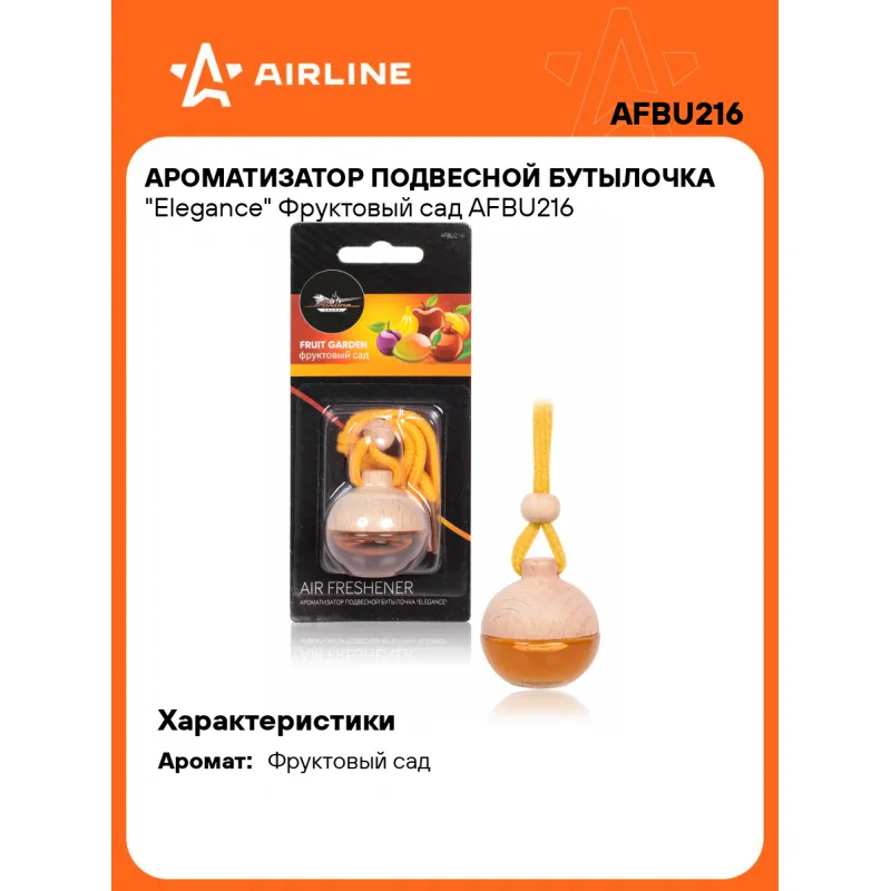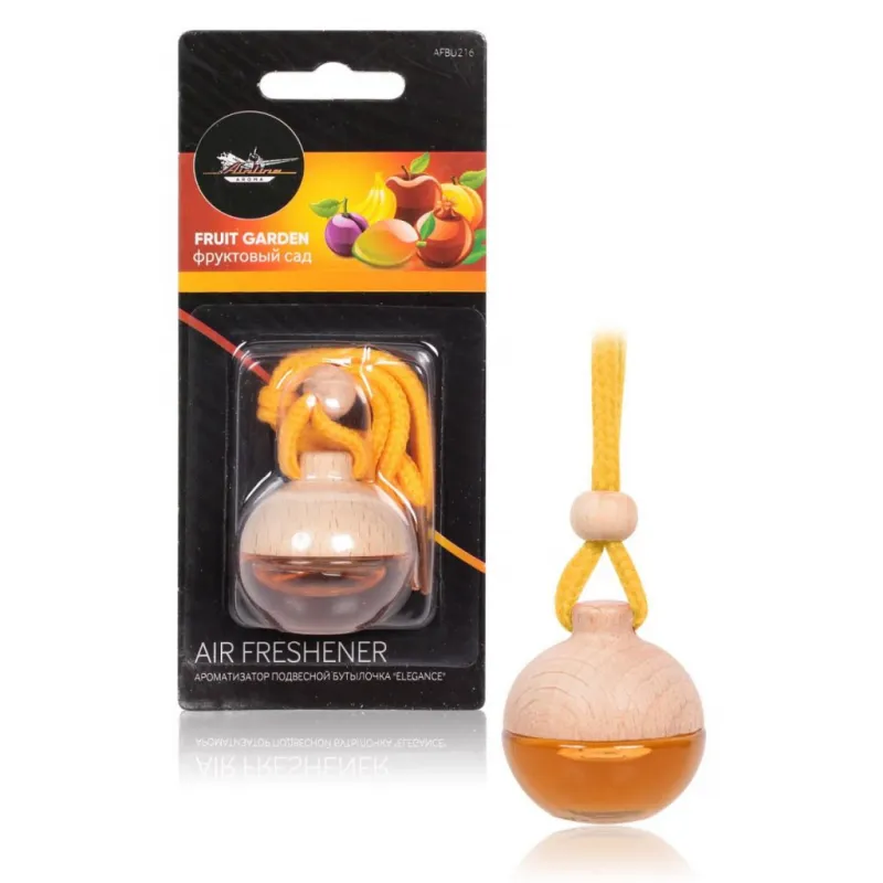 Ароматизатор подвесной бутылочка "Elegance" Фруктовый сад Описание: Ароматизатор для автомобиля - подвесной бутылочка Elegance "Фруктовый сад" от AFBU216 - универсальный ароматизатор для дома и авто, который можно расположить в любом удобном месте. Ароматизатор "Elegance" - новинка на рынке. Элегантный дизайн: оригинальный округлый флакон и деревянная крышечка. Интенсивность аромата регулируется самостоятельно. Аромат до 45 дней! Аромат яркого фруктового сада обладает антидепрессивным и бодрящим эффектом, дарит ощущение радости и счастья. ВНИМАНИЕ: располагать строго вертикально и регулярно проверять плотность закрывания крышки. Знакомый и ненавязчивый аромат для создания приятной атмосферы и подавления неприятных запахов. Особенности: - Варианты крепления: подвесной, на зеркало, в бардачок, на солнцезащитный козырек, под сиденье, в гардеробе, в шкаф, для дома; - Состав - парфюмированная жидкость, стекло, дерево; - Универсальный - подходит для мужчин и женщин; - Не содержит спирт; Товар официального производителя AIRLINE. Духи в машину - это мини диффузор с автопарфюмом, который подарит свежесть и приятный аромат салону вашего автомобиля. Ароматизатор для машины в салон или для дома станет отличным подарком автомобилисту, мужчине и женщине, автолюбителю, папе, отцу, мужу, парню и другу на день рождения, 23 февраля, Новый год или любой другой праздник. Характеристики: Артикул: AFBU216 Аромат: Фруктовый сад Объем, мл: 5 Комплектация: Ароматизатор в блистерной упаковке - 1 шт Гарантия: от 1 года.
