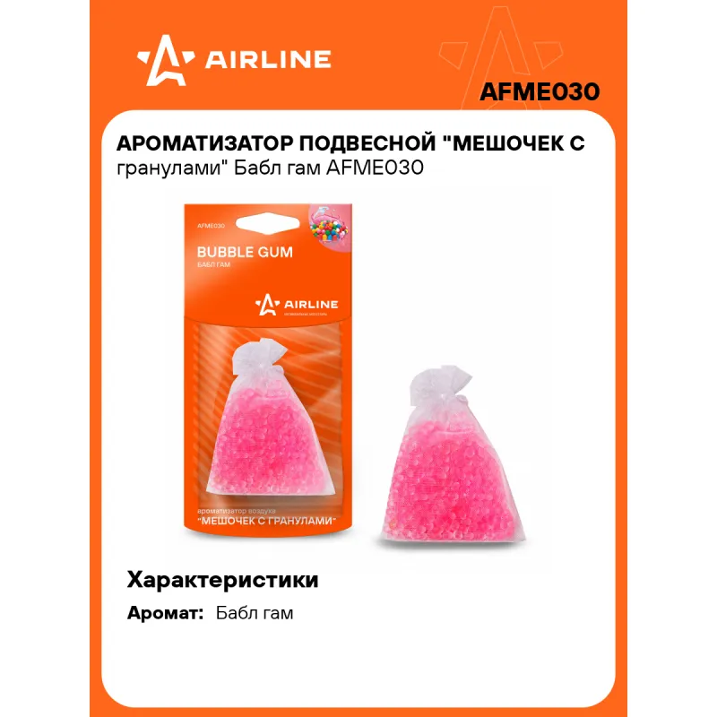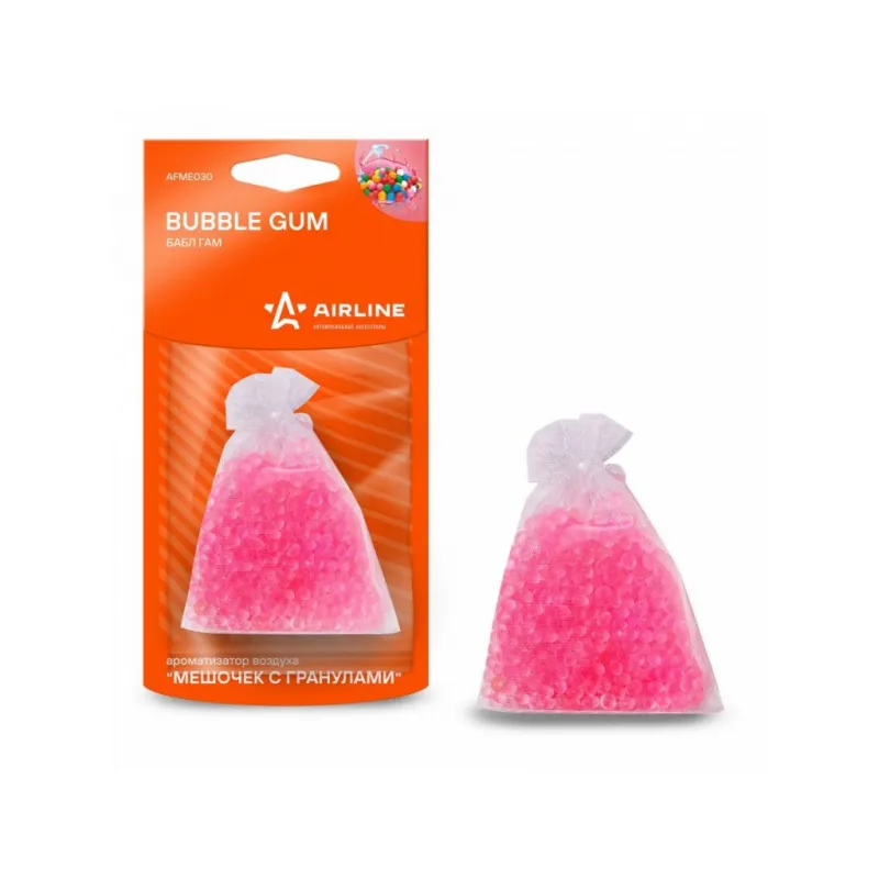 Ароматизатор подвесной "Мешочек с гранулами" Бабл гам Описание: Ароматизатор для автомобиля - Подвесной "Мешочек с гранулами "Бабл гам" от AFME030 - универсальный ароматизатор для дома и авто, который можно расположить в любом удобном месте. Яркий аромат из детства со вкусом фруктовой жвачки дарит ощущение радости, бодрости и хорошего настроения. Знакомый и ненавязчивый аромат для создания приятной атмосферы и подавления неприятных запахов. Особенности: - Полностью российское производство; - Современный дизайн упаковки; - Высококачественные отдушки, над которыми работает настоящий профессиональный парфюмер; - Все ароматизаторы выполнены из полимера, в состав которого введена отдушка (отдушка вводится в жидкий полимер, что является самой правильной технологией и позволяет добиться максимально долгого аромата); - Варианты крепления: в дефлектор, в гардеробе, в шкаф, для дома; - Состав - полимер, парфюмерная отдушка; - Не содержит спирт; Товар официального производителя AIRLINE. Духи в машину - это мини диффузор с автопарфюмом, который подарит свежесть и приятный аромат салону вашего автомобиля. Ароматизатор для машины в салон или для дома станет отличным подарком автомобилисту, мужчине и женщине, автолюбителю, папе, отцу, мужу, парню и другу на день рождения, 23 февраля, Новый год или любой другой праздник. Характеристики: Артикул: AFME030 Аромат: Бабл гам Вес, г: 20 Комплектация: Ароматизатор в ПЭ пакете с картонным навершием - 1 шт Гарантия: от 1 года.