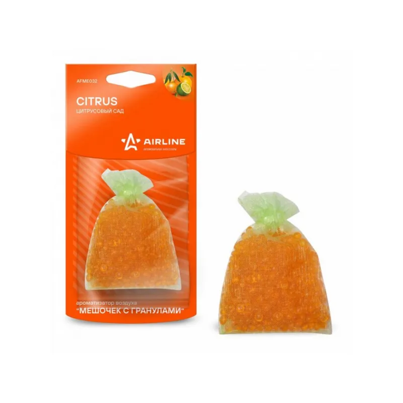 Ароматизатор подвесной "Мешочек с гранулами" Цитрусовый сад Описание: Ароматизатор для автомобиля - Подвесной "Мешочек с гранулами "Цитрусовый сад" от AFME032 - универсальный ароматизатор для дома и авто, который можно расположить в любом удобном месте. Аромат яркого цитрусового сада обладает антидепрессивным и бодрящим эффектом, дарит ощущение радости и счастья. Знакомый и ненавязчивый аромат для создания приятной атмосферы и подавления неприятных запахов. Особенности: - Полностью российское производство; - Современный дизайн упаковки; - Высококачественные отдушки, над которыми работает настоящий профессиональный парфюмер; - Все ароматизаторы выполнены из полимера, в состав которого введена отдушка (отдушка вводится в жидкий полимер, что является самой правильной технологией и позволяет добиться максимально долгого аромата); - Варианты крепления: в дефлектор, в гардеробе, в шкаф, для дома; - Состав - полимер, парфюмерная отдушка; - Не содержит спирт; Товар официального производителя AIRLINE. Духи в машину - это мини диффузор с автопарфюмом, который подарит свежесть и приятный аромат салону вашего автомобиля. Ароматизатор для машины в салон или для дома станет отличным подарком автомобилисту, мужчине и женщине, автолюбителю, папе, отцу, мужу, парню и другу на день рождения, 23 февраля, Новый год или любой другой праздник. Характеристики: Артикул: AFME032 Аромат: Цитрусовый сад Вес, г: 20 Комплектация: Ароматизатор в ПЭ пакете с картонным навершием - 1 шт Гарантия: от 1 года.