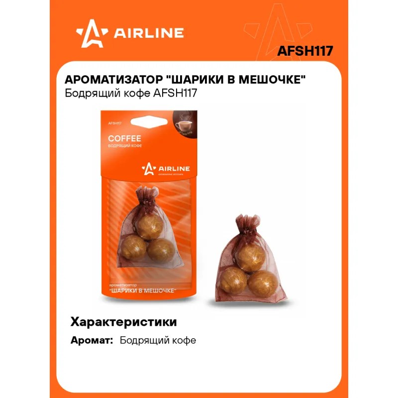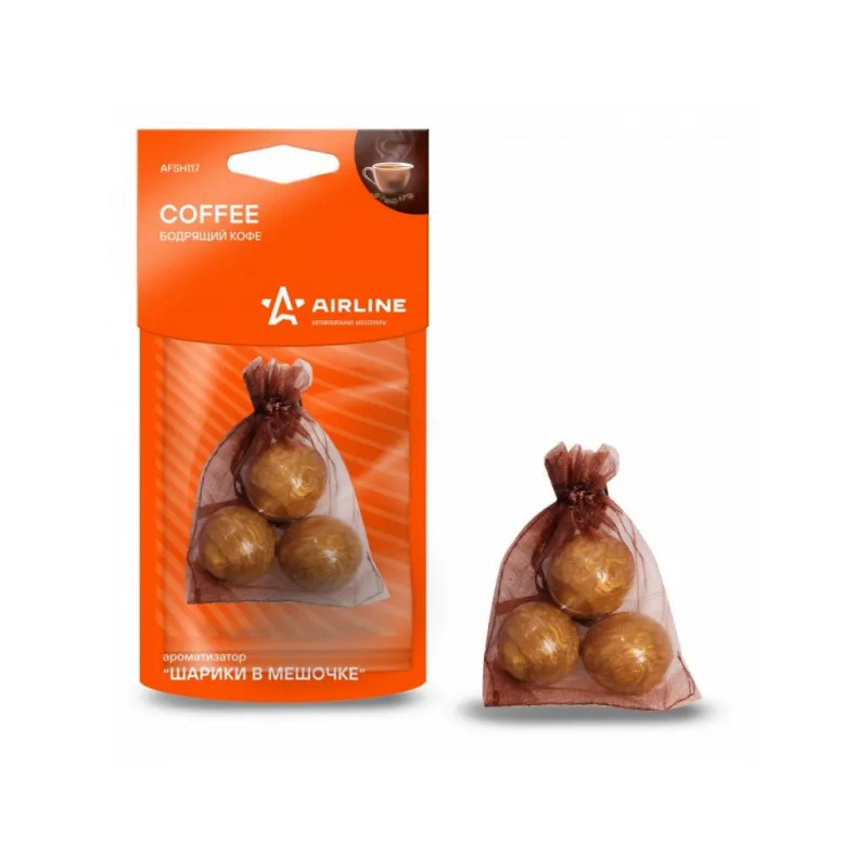 Ароматизатор "Шарики в мешочке" Бодрящий кофе Описание: Ароматизатор для автомобиля - Подвесной "Шарики в мешочке" "Бодрящий кофе" от AFSH117 - универсальный ароматизатор для дома и авто, который можно расположить в любом удобном месте. Аромат свежесваренного кофе улучшает самочувствие, активизирует иммунную систему и стимулирует работу мозга, дает ощущение тепла и уюта. Знакомый и ненавязчивый аромат для создания приятной атмосферы и подавления неприятных запахов. Особенности: - Полностью российское производство; - Современный дизайн упаковки; - Высококачественные отдушки, над которыми работает настоящий профессиональный парфюмер; - Все ароматизаторы выполнены из полимера, в состав которого введена отдушка (отдушка вводится в жидкий полимер, что является самой правильной технологией и позволяет добиться максимально долгого аромата); - Варианты крепления: в дефлектор, в гардеробе, в шкаф, для дома; - Состав - полимер, парфюмерная отдушка; - Не содержит спирт; Товар официального производителя AIRLINE. Духи в машину - это мини диффузор с автопарфюмом, который подарит свежесть и приятный аромат салону вашего автомобиля. Ароматизатор для машины в салон или для дома станет отличным подарком автомобилисту, мужчине и женщине, автолюбителю, папе, отцу, мужу, парню и другу на день рождения, 23 февраля, Новый год или любой другой праздник. Характеристики: Артикул: AFSH117 Аромат: Бодрящий кофе Комплектация: Ароматизатор в ПЭ пакете с картонным навершием - 1 шт Гарантия: от 1 года.
