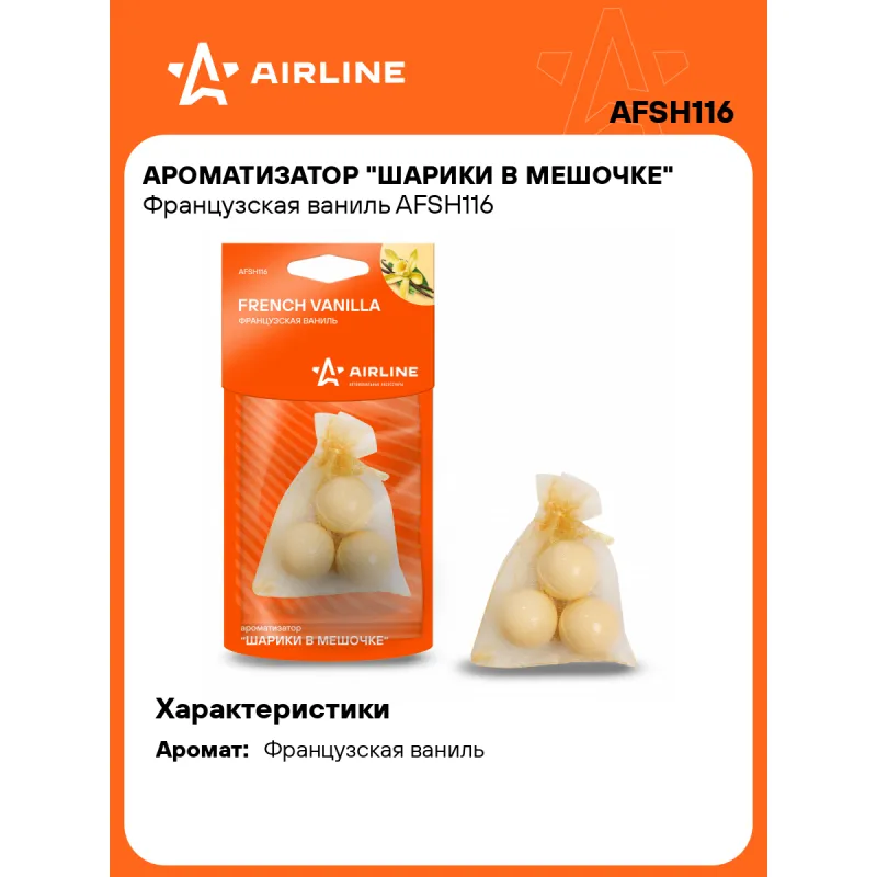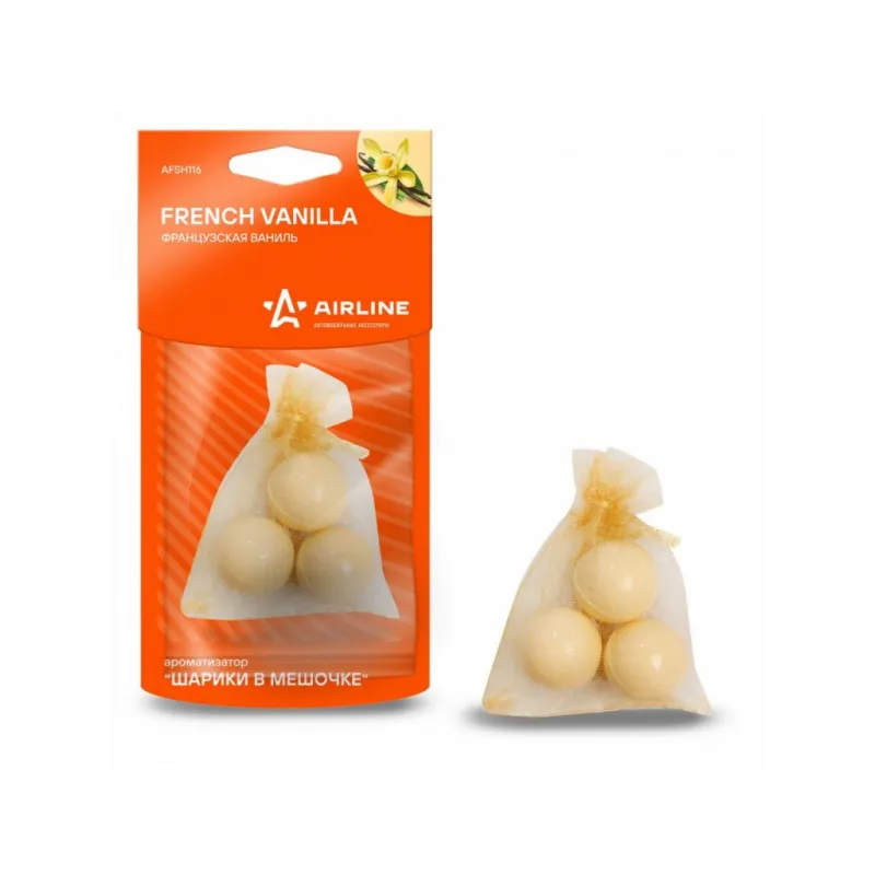 Ароматизатор "Шарики в мешочке" Французская ваниль Описание: Ароматизатор для автомобиля - Подвесной "Шарики в мешочке" "Французская ваниль" от AFSH116 - универсальный ароматизатор для дома и авто, который можно расположить в любом удобном месте. Сладкий, немного пряный, насыщенный аромат французской ванили вселяет энергию, гармонизирует, способствует концентрации. Знакомый и ненавязчивый аромат для создания приятной атмосферы и подавления неприятных запахов. Особенности: - Полностью российское производство; - Современный дизайн упаковки; - Высококачественные отдушки, над которыми работает настоящий профессиональный парфюмер; - Все ароматизаторы выполнены из полимера, в состав которого введена отдушка (отдушка вводится в жидкий полимер, что является самой правильной технологией и позволяет добиться максимально долгого аромата); - Варианты крепления: в дефлектор, в гардеробе, в шкаф, для дома; - Состав - полимер, парфюмерная отдушка; - Не содержит спирт; Товар официального производителя AIRLINE. Духи в машину - это мини диффузор с автопарфюмом, который подарит свежесть и приятный аромат салону вашего автомобиля. Ароматизатор для машины в салон или для дома станет отличным подарком автомобилисту, мужчине и женщине, автолюбителю, папе, отцу, мужу, парню и другу на день рождения, 23 февраля, Новый год или любой другой праздник. Характеристики: Артикул: AFSH116 Аромат: Французская ваниль Комплектация: Ароматизатор в ПЭ пакете с картонным навершием - 1 шт Гарантия: от 1 года.