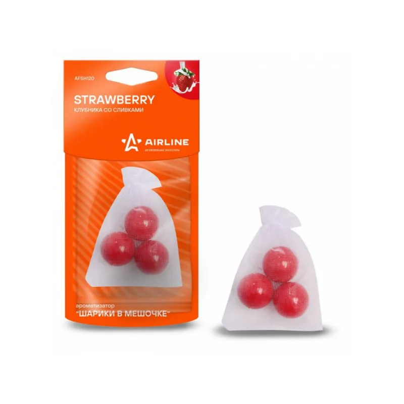 Ароматизатор "Шарики в мешочке" Клубника со сливками Описание: Ароматизатор для автомобиля - Подвесной "Шарики в мешочке" "Клубника со сливками" от AFSH120 - универсальный ароматизатор для дома и авто, который можно расположить в любом удобном месте. Радостный, сладкий, легкий аромат клубники поднимает настроение, снижает эмоциональное напряжение. Знакомый и ненавязчивый аромат для создания приятной атмосферы и подавления неприятных запахов. Особенности: - Полностью российское производство; - Современный дизайн упаковки; - Высококачественные отдушки, над которыми работает настоящий профессиональный парфюмер; - Все ароматизаторы выполнены из полимера, в состав которого введена отдушка (отдушка вводится в жидкий полимер, что является самой правильной технологией и позволяет добиться максимально долгого аромата); - Варианты крепления: в дефлектор, в гардеробе, в шкаф, для дома; - Состав - полимер, парфюмерная отдушка; - Не содержит спирт; Товар официального производителя AIRLINE. Духи в машину - это мини диффузор с автопарфюмом, который подарит свежесть и приятный аромат салону вашего автомобиля. Ароматизатор для машины в салон или для дома станет отличным подарком автомобилисту, мужчине и женщине, автолюбителю, папе, отцу, мужу, парню и другу на день рождения, 23 февраля, Новый год или любой другой праздник. Характеристики: Артикул: AFSH120 Аромат: Клубника со сливками Комплектация: Ароматизатор в ПЭ пакете с картонным навершием - 1 шт Гарантия: от 1 года.