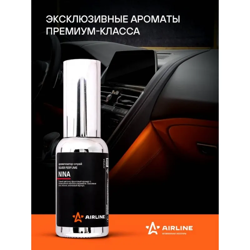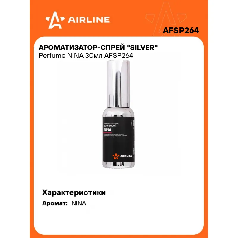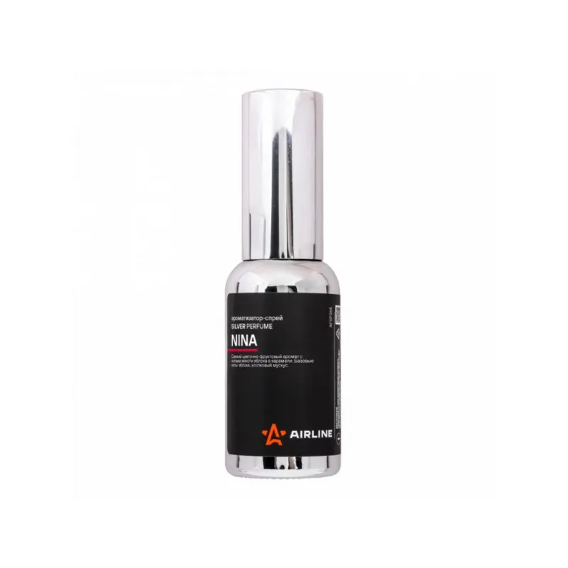 Ароматизатор-спрей "SILVER" Perfume NINA 30мл Описание: Ароматизатор для автомобиля - спрей "SILVER" Perfume "NINA" от AFSP264 - универсальный ароматизатор для дома и авто, который можно расположить в любом удобном месте. Ароматизатор представляет собой флакон с парфюмом. Cвежий цветочно-фруктовый аромат с нотами мякоти фрукта с хрустящей глазурью - яблока в карамели. Начальные ноты: калабрийский лимон, кайперинья лайм. Ноты сердца: красное яблоко в карамели, ваниль, лепестки пиона, лунный цветок. Базовые ноты: яблоня, хлопковый мускус. По мотивам Nina Ricci Nina. Знакомый и ненавязчивый аромат для создания приятной атмосферы и подавления неприятных запахов. Особенности: - Варианты крепления: подвесной, на зеркало, в бардачок, на солнцезащитный козырек, под сиденье, в гардеробе, в шкаф, для дома; - Состав - вода, отдушка, эмульгатор, АИПС, консервант; - Универсальный - подходит для мужчин и женщин; - Не содержит спирт; Товар официального производителя AIRLINE. Духи в машину - это мини диффузор с автопарфюмом, который подарит свежесть и приятный аромат салону вашего автомобиля. Ароматизатор для машины в салон или для дома станет отличным подарком автомобилисту, мужчине и женщине, автолюбителю, папе, отцу, мужу, парню и другу на день рождения, 23 февраля, Новый год или любой другой праздник. Характеристики: Артикул: AFSP264 Аромат: NINA Объем, мл: 30 Комплектация: Ароматизатор в стеклянном флаконе - 1 шт Гарантия: от 1 года.