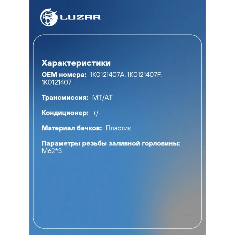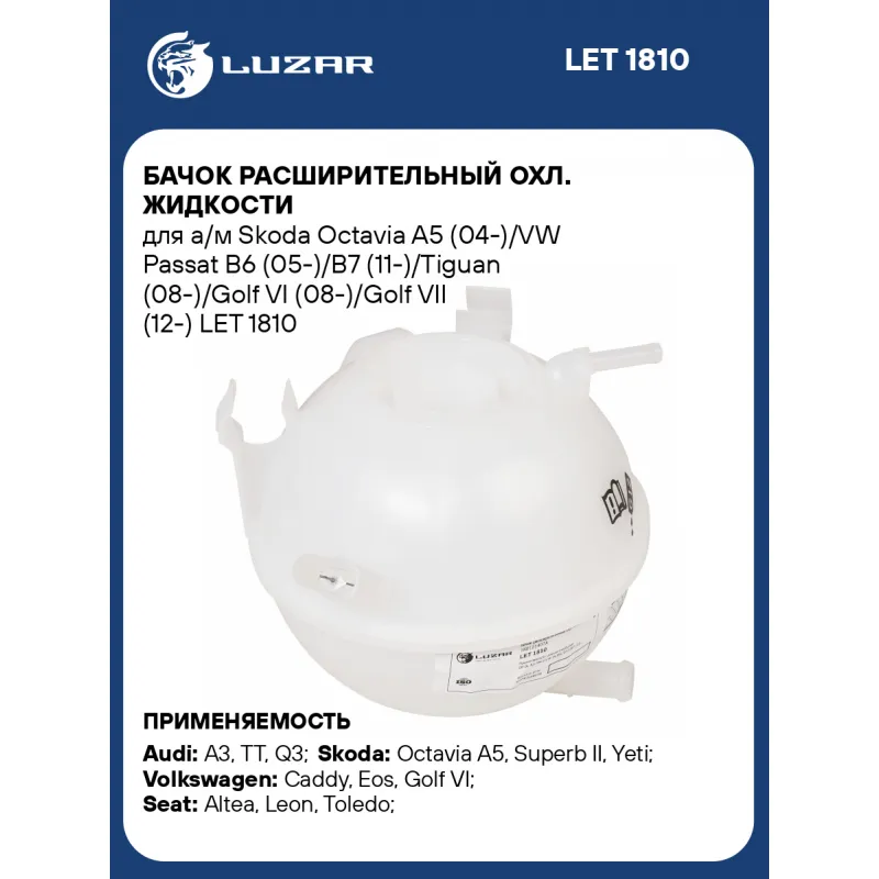 Бачок расширительный охл. жидкости для а/м Skoda Octavia A5 (04-)/VW Passat B6 (05-)/B7 (11-)/Tiguan (08-)/Golf VI (08-)/Golf VII (12-) Характеристики: Артикул: LET 1810 OEM номера: 1K0121407A, 1K0121407F, 1K0121407 Трансмиссия: MT/AT Кондиционер: +/- Габариты изделия, мм: 207*180*153,7 Материал бачков: пластик Количество на автомобиль: 1 Подходящий разъем AIRLINE:: AECC310 Параметры резьбы заливной горловины: M62*3 Подходит для авто: Audi A3 (03-), TT (06-), A3 (03-), Q3 (11-), Q3 (11-) Skoda Octavia A5 (04-), Superb II (08-), Yeti (09-), Octavia A5 (04-), Yeti (09-) Volkswagen Caddy (04-), Caddy (04-), Eos (06-), Golf VI (08-), Passat B6 (05-), Passat B6 (05-), Passat B8 (15-), Tiguan (08-), Jetta (05-), Jetta (11-), Caddy (04-), CC (11-), Eos (06-), Golf V (03-), Golf VI (08-), Passat B6 (05-), Passat B7 (10-), Passat B8 (15-), Jetta (05-) Seat Altea (04-), Altea (04-), Leon (05-), Leon (05-), Toledo (04-), Toledo (04-) Для проверки применяемости отправьте VIN автомобиля через вкладку "Есть вопросы о товаре?" Комплектация: Бачок расширительный Паспорт изделия Гарантия: от 1 года.