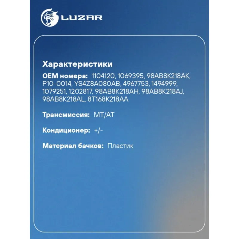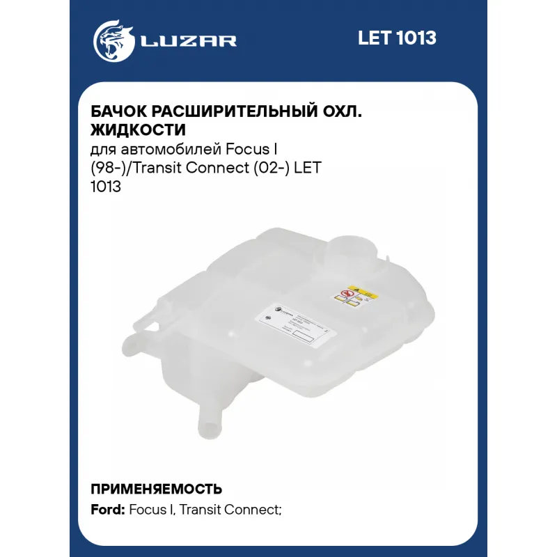 Бачок расширительный охл. жидкости для автомобилей Focus I (98-)/Transit Connect (02-) Характеристики: Артикул: LET 1013 OEM номера: 1104120, 1069395, 98AB8K218AK, P10-0014, YS4Z8A080AB, 4967753, 1494999, 1079251, 1202817, 98AB8K218AH, 98AB8K218AJ, 98AB8K218AL, 8T168K218AA Материал бачков: пластик Количество на автомобиль: 1 Трансмиссия: MT/AT Кондиционер: +/- Подходит для авто: Ford Focus I (98-), Transit Connect (02-), Tourneo Connect I (02-), Transit Connect (02-) Для проверки применяемости отправьте VIN автомобиля через вкладку "Есть вопросы о товаре?" Комплектация: Бачок расширительный Паспорт изделия Гарантия: от 1 года.