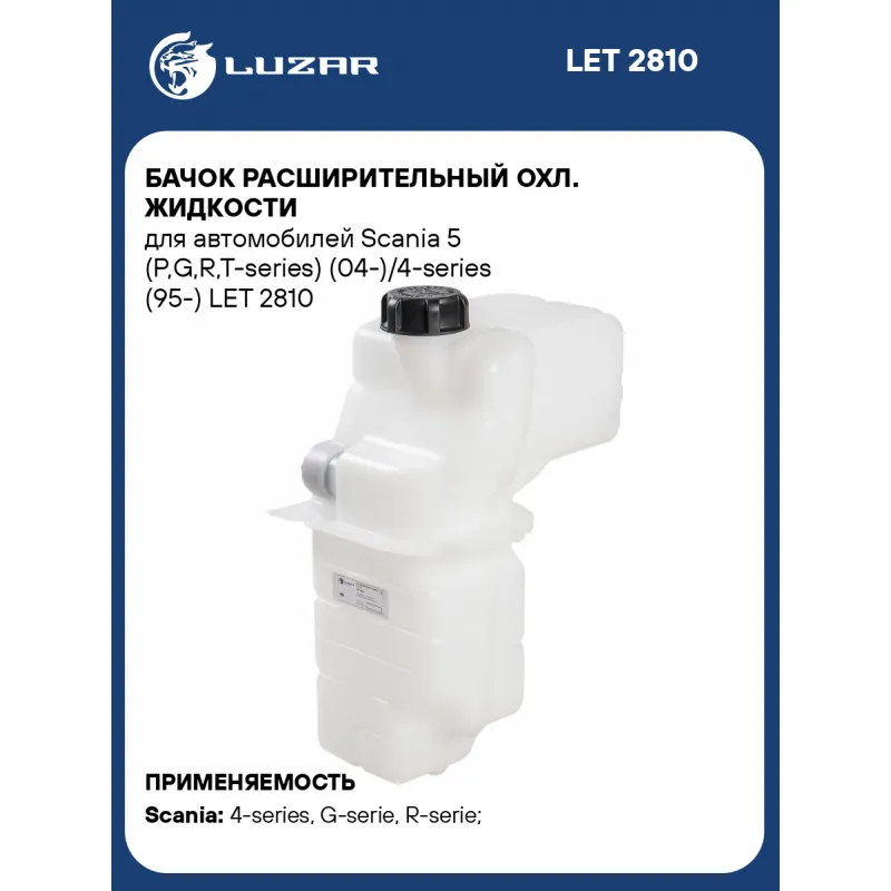 Бачок расширительный охл. жидкости для автомобилей Scania 5 (P,G,R,T-series) (04-)/4-series (95-) Характеристики: Артикул: LET 2810 OEM номера: 1765735, 1492421, 1511775, 1421090, 1855164, 1370707, 1894478, 2401668, 1385966 Габариты изделия, мм: 483,2*333*233,3 Материал бачков: пластик Количество на автомобиль: 1 Трансмиссия: MT/AT Кондиционер: +/- Комплектация:: с крышкой Подходит для авто: Scania 4-series (95-), G-serie (04-), R-serie (04-), T-serie (04-), P-serie (04-) Для проверки применяемости отправьте VIN автомобиля через вкладку "Есть вопросы о товаре?" Комплектация: Бачок расширительный Паспорт изделия Крышка расширительного бачка Гарантия: от 1 года.