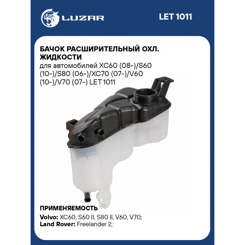 Бачок расширительный охл. жидкости для а/м Volvo S60 (10-)/V60 (10-) 1.6i/2.0i Характеристики: Артикул: LET 1011 OEM номера: 31439508, 31338195 Габариты изделия, мм: 249,1*152,7*218,5 Материал бачков: пластик Количество на автомобиль: 1 Трансмиссия: MT/AT Кондиционер: +/- Подходит для авто: Volvo XC60 (07-), S60 II (10-), S80 II (06-), V60 (10-), V70 (07-), V70 (07-), XC60 (07-), XC70 (07-), S60 II (10-), S80 II (06-), V60 (10-), V70 (07-) Land Rover Freelander 2 (11-), Range Rover Evoque (11-) Для проверки применяемости отправьте VIN автомобиля через вкладку "Есть вопросы о товаре?" Комплектация: Бачок расширительный Паспорт изделия Гарантия: от 1 года.