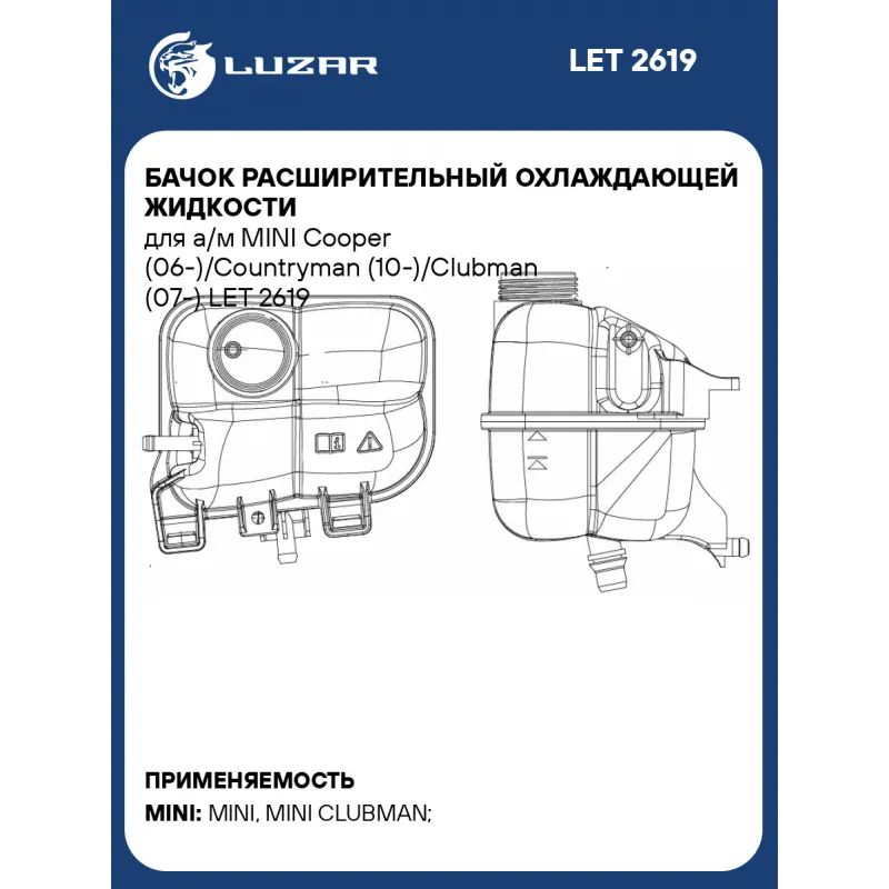 Бачок расширительный охлаждающей жидкости для а/м MINI Cooper (06-)/Countryman (10-)/Clubman (07-) Характеристики: Артикул: LET 2619 OEM номера: 17137823626, 17137539267 Трансмиссия: MT/AT Кондиционер: +/- Габариты изделия, мм: 166,6*165,1*151,6 Сопутствующий товар: Радиаторы охлаждения: LRc 2601 Сопутствующий товар: Крышки (про... Читать полностью →
