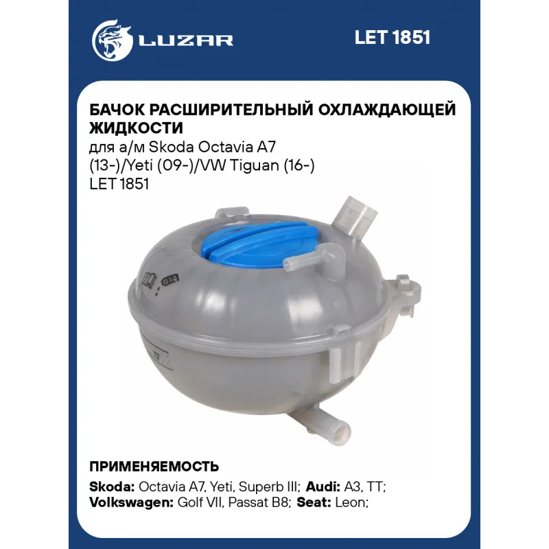 Бачок расширительный охлаждающей жидкости для а/м Skoda Octavia A7 (13-)/Yeti (09-)/VW Tiguan (16-) Характеристики: Артикул: LET 1851 OEM номера: 5Q0121407M, 5Q0121407D, 5Q0121407A, 5Q0121407F, 5Q0121407G, 5Q0121407S, 5Q0121407T, 5QM121407B Трансмиссия: MT/AT Кондиционер: +/- Габариты изделия, мм: 196*192,3*158,5 Сопутствующий товар: Радиаторы охлаждения: LRc 1851 Сопутствующий товар: Крышки (пробки) расширительного бачка: LL 1835 Количество на автомобиль: 1 Материал бачков: пластик Комплектация:: с крышкой Подходит для авто: Skoda Octavia A7 (13-), Octavia A7 (13-), Yeti (09-), Octavia A7 (13-), Superb III (15-), Yeti (09-) Audi A3 (12-), TT (14-) Volkswagen Golf VII (12-), Passat B8 (15-), Scirocco (08-), Golf VII (12-), Passat B8 (15-), Tiguan (16-), Touran III (15-) Seat Leon (12-) Для проверки применяемости отправьте VIN автомобиля через вкладку "Есть вопросы о товаре?" Комплектация: Бачок расширительный - 1 шт Паспорт изделия - 1 шт Крышка расширительного бачка - 1 шт Гарантия: от 1 года.