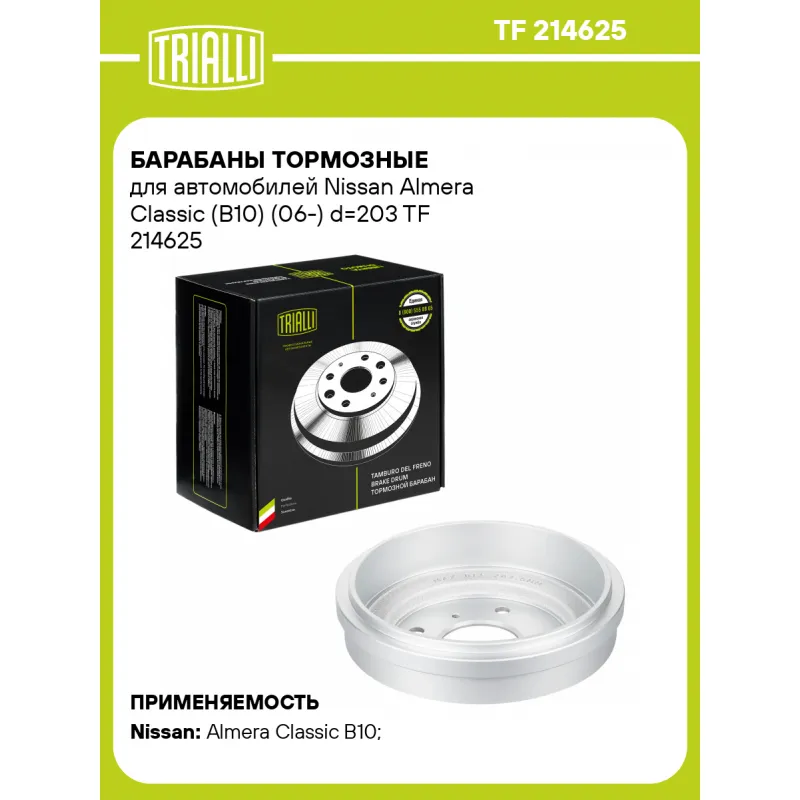 Барабаны тормозные для автомобилей Nissan Almera Classic (B10) (06-) d=203 Характеристики: Артикул: TF 214625 OEM номера: 43200-95F0C Количество на автомобиль: 2 Внутр. высота торм. барабана: 43.4 Гарантийный срок: 2 года / 60 000 км Сторона установки: Задняя ось Материал: Чугун Общая высота торм. барабана: 66.5 Количество отверстий: 4 Диаметр центрирования: 68 Наружный диаметр, мм: 236 Максимальный размер расточки тормозного барабана: 204.5 Разболтовка (PCD): 4*114,3 Сопутствующий товар: Колодки тормозные барабанные: GF 1402 Сопутствующий товар: Цилиндры заднего тормоза: CF 0132 Товарная линейка: BLACK Количество в коробке, шт.: 2 Внутренний диаметр торм. барабана: 203.3 Подходит для авто: Nissan Almera Classic B10 (06-) Для проверки применяемости отправьте VIN автомобиля через вкладку "Есть вопросы о товаре?" Комплектация: Барабан тормозной - 1 шт Гарантия: от 1 года.