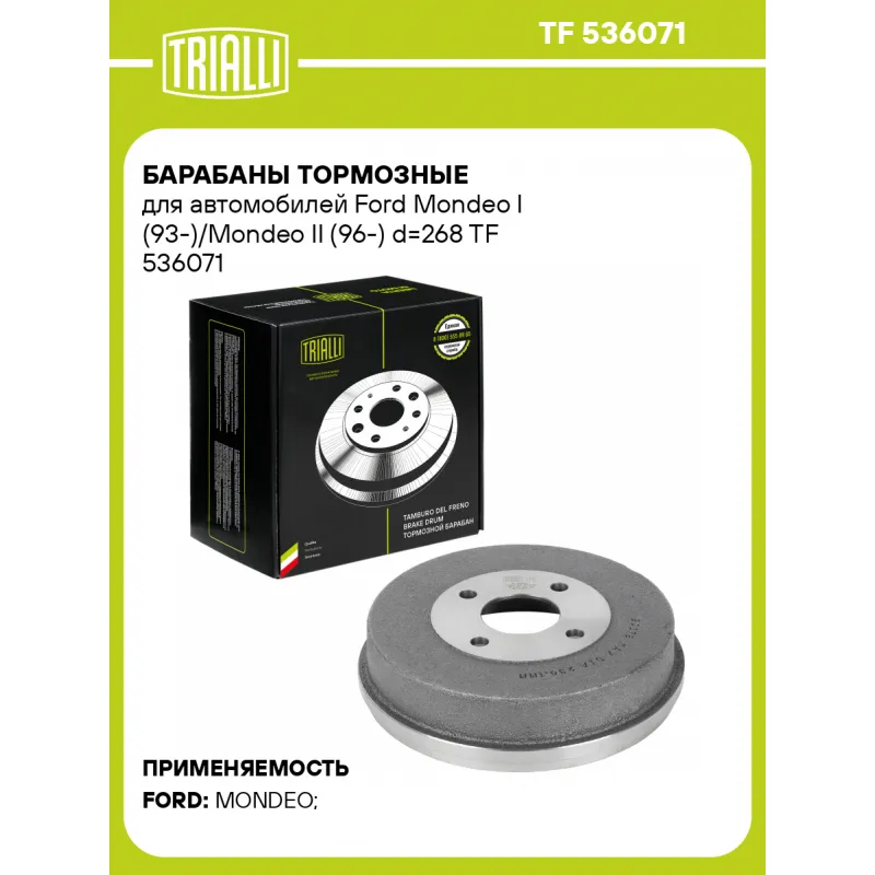 Барабаны тормозные для автомобилей Ford Mondeo I (93-)/Mondeo II (96-) d=268 Характеристики: Артикул: TF 536071 OEM номера: 1027371 Гарантийный срок: 2 года / 60 000 км Сопутствующий товар: Колодки тормозные барабанные: GF 1068 Сопутствующий товар: Цилиндры заднего тормоза: CF 2328 Количество на автомобиль: 2 Диаметр располож. креп. отверстий: 108 Материал: Чугун Внутр. высота торм. барабана: 56,8 Общая высота торм. барабана: 66,4 Количество отверстий: 4 Диаметр центрирования: 63,6 Наружный диаметр, мм: 268,6 Максимальный размер расточки тормозного барабана: 230,1 Разболтовка (PCD): 4*108 Товарная линейка: BLACK Количество в коробке, шт.: 2 Внутренний диаметр торм. барабана: 228,6 Сторона установки: Задняя ось Комплектация: Барабан тормозной - 1 шт Гарантия: от 1 года.