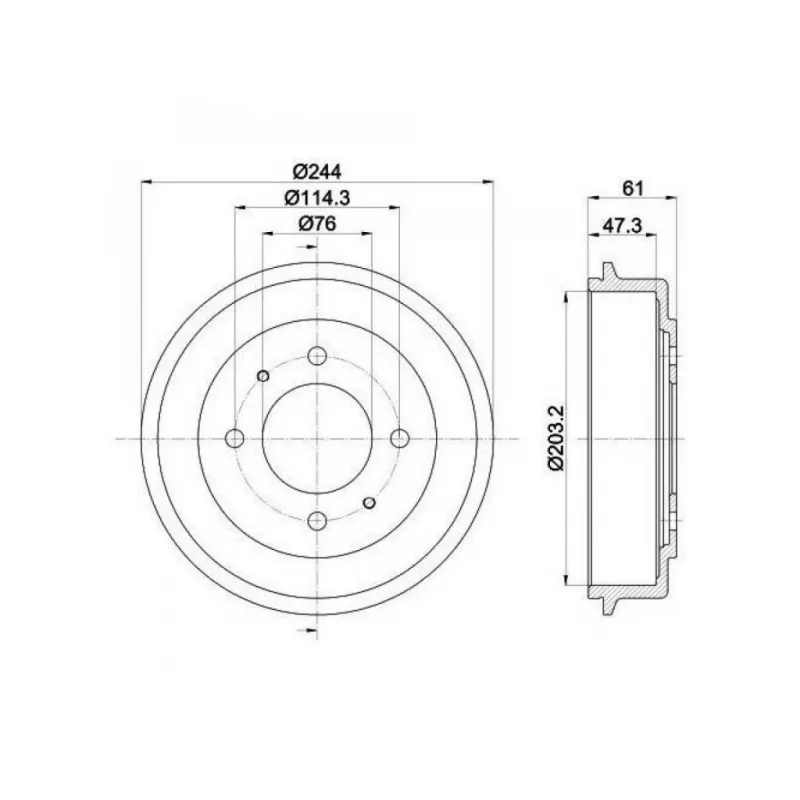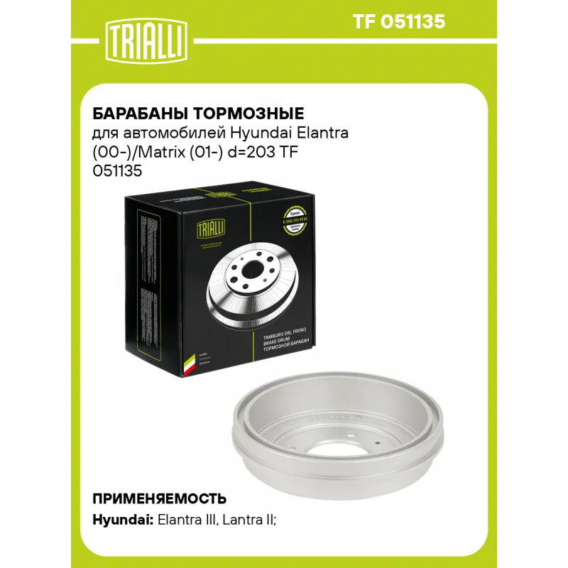 Барабаны тормозные для автомобилей Hyundai Elantra (00-)/Matrix (01-) d=203 Характеристики: Артикул: TF 051135 OEM номера: 5275129000, 5841129000, 5841117100, 5841117200, 5841129100, 5841129A00 Сопутствующий товар: Колодки тормозные барабанные: GF 0846 Количество на автомобиль: 2 Гарантийный срок: 2 года / 60 000 км Материал: Чугун Внутр. высота торм. барабана: 46 Общая высота торм. барабана: 61 Количество отверстий: 4 Диаметр центрирования: 76 Наружный диаметр, мм: 244 Максимальный размер расточки тормозного барабана: 205.2 Разболтовка (PCD): 4*114,3 Сопутствующий товар: Цилиндры заднего тормоза: CF 1561 Товарная линейка: BLACK Количество в коробке, шт.: 2 Внутренний диаметр торм. барабана: 203 Сторона установки: Задняя ось Подходит для авто: Hyundai Elantra III (00-), Lantra II (95-), Lantra II (95-), Matrix (01-) Для проверки применяемости отправьте VIN автомобиля через вкладку "Есть вопросы о товаре?" Комплектация: Барабан тормозной - 1 шт Гарантия: от 1 года.